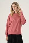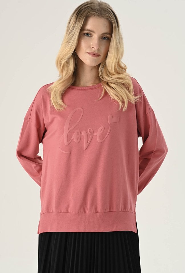 Bluzka w klasycznym fasonie, wykonana z przyjemnej w dotyku dzianiny bawełnianej. Na przodzie znajduje się ozdobna aplikacja. Bluza posiada okrągły dekolt, długi rękaw i brzegi wykończone ściągaczami. Idealnie sprawdzi się w codziennych stylizacjach. Modelka na zdjęciu ma 173 cm wzrostu i prezentuje rozmiar 36.