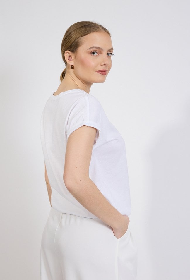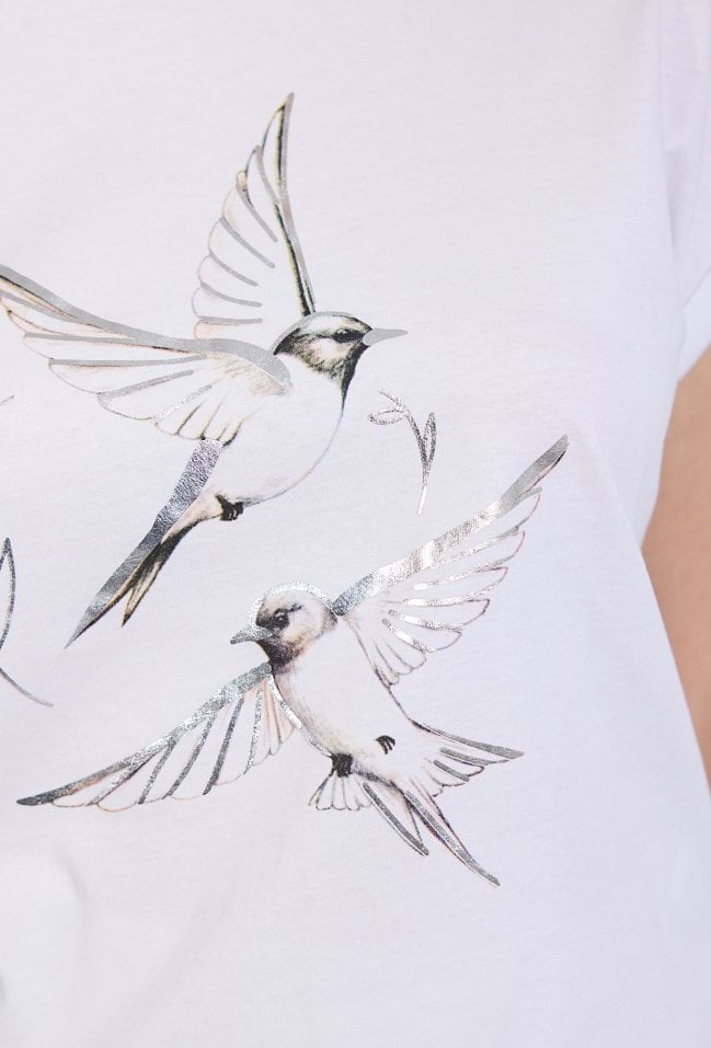 T-shirt damski o swobodnym, komfortowym kroju. Model z krótkim rękawem oraz klasycznym, zaokrąglonym dekoltem. Przód zdobi subtelny nadruk z motywem ptaków w locie, który nadaje koszulce lekkiego i nowoczesnego charakteru. Modelka na zdjęciu ma 177 cm wzrostu i prezentuje rozmiar S,