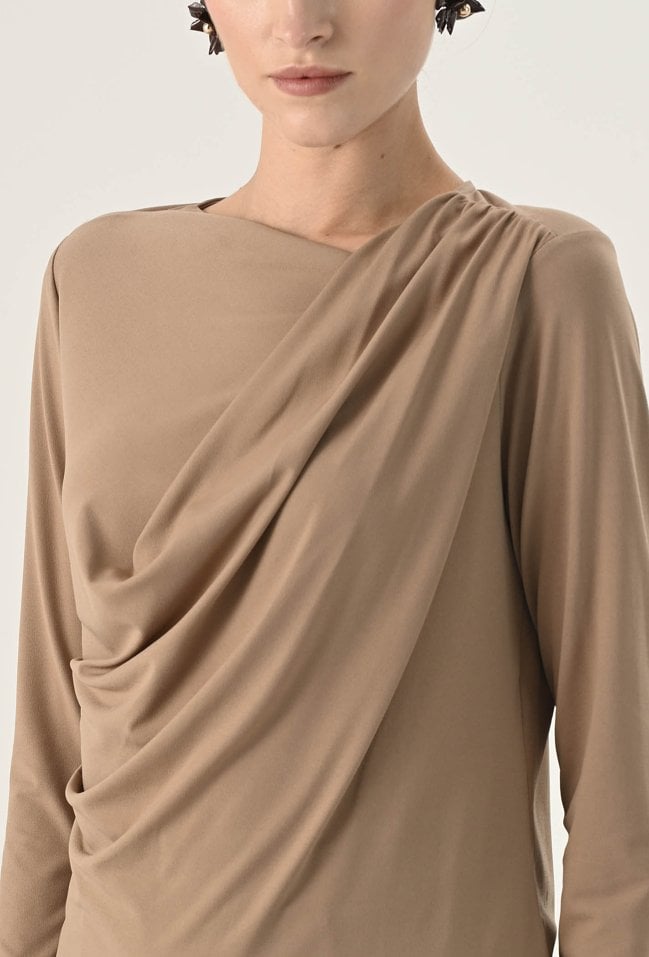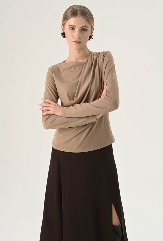 Stylowa i nowoczesna bluzka o asymetrycznym kroju, która przyciąga uwagę nietypowym ułożeniem materiału. Wykonana z elastycznej, miękko układającej się dzianiny, pięknie dopasowuje się do sylwetki, podkreślając jej kształt. Charakterystyczne drapowanie z przodu i przesunięty dekolt nadają całości oryginalny, lekko awangardowy charakter. Bluzka sprawdzi się zarówno w codziennych, jak i bardziej eleganckich stylizacjach – wystarczy dodać proste spodnie lub spódnicę, by stworzyć efektowny look. Modelka na zdjęciu ma 177 cm wzrostu i prezentuje rozmiar 36/S.