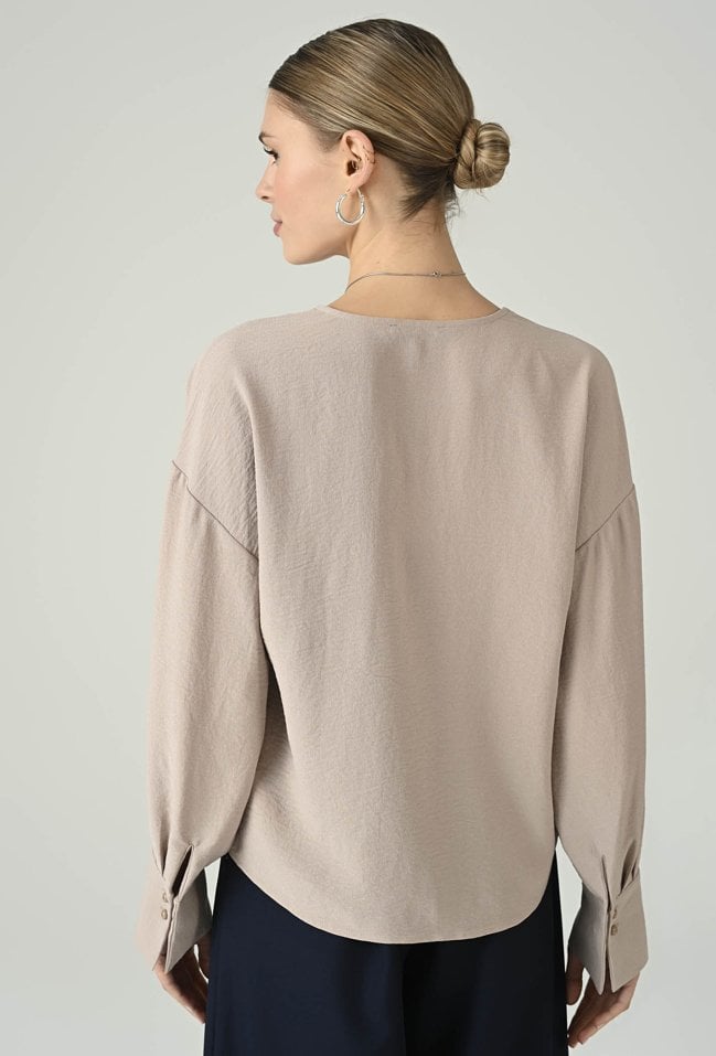 Kobieca bluzka w beżowym odcieniu, która zachwyca subtelną elegancją i uniwersalnym charakterem. Dekolt w kształcie litery V optycznie wysmukla górną część sylwetki, a delikatne zapięcie z przodu dodaje całości lekkości i dyskretnego uroku. Długie rękawy zakończone mankietami podkreślają dopracowane wykończenie, a swobodniejszy fason zapewnia komfort noszenia przez cały dzień. To idealna propozycja do biura, na spotkania i wieczorne wyjścia — świetnie komponuje się ze spodniami materiałowymi, spódnicą lub eleganckimi jeansami.