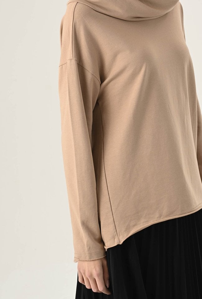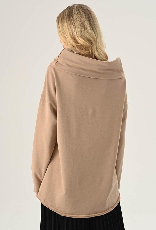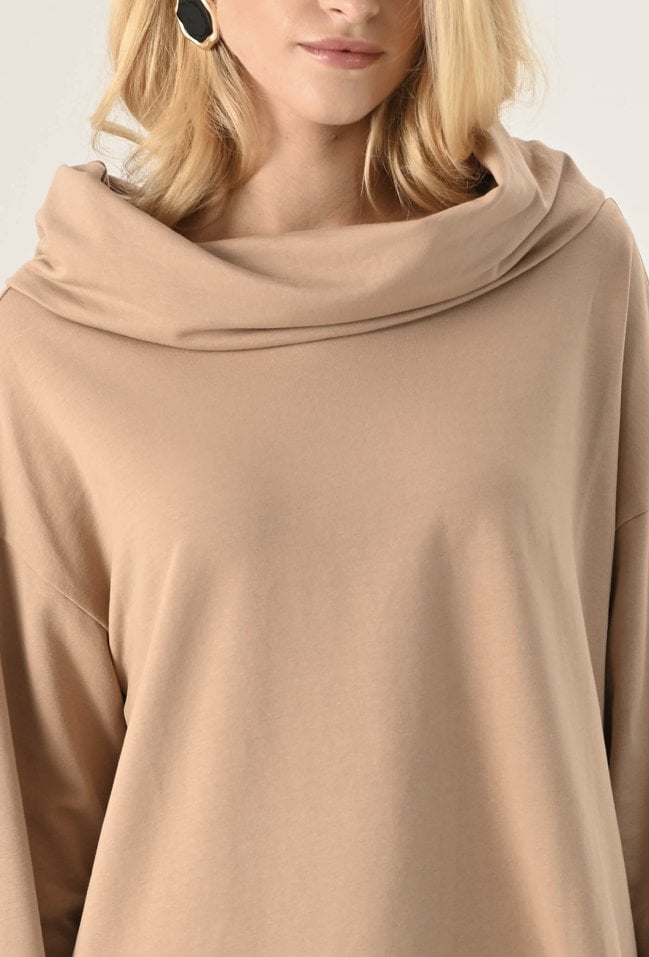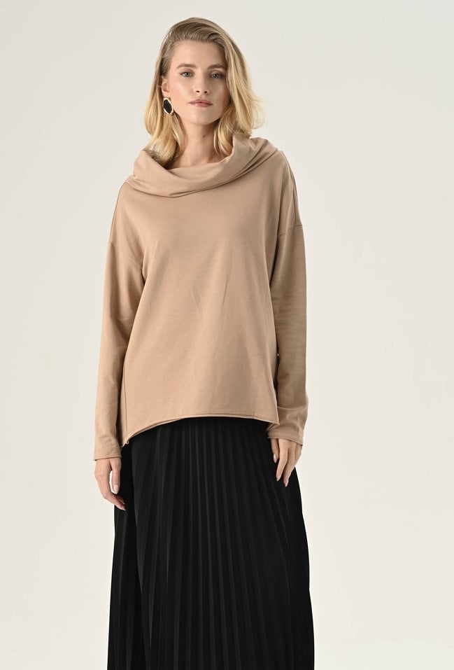 Bluza w pięknym beżowym kolorze z szeroką stójką Posiada długi rękaw wraz z obniżoną linią ramion oraz surowe wykończenie. Ten model będzie idealną propozycja na co dzień w zestawie z spodniami dresowymi lub jeansami. Modelka na zdjęciu ma 177 cm wzrostu i prezentuje rozmiar 36.