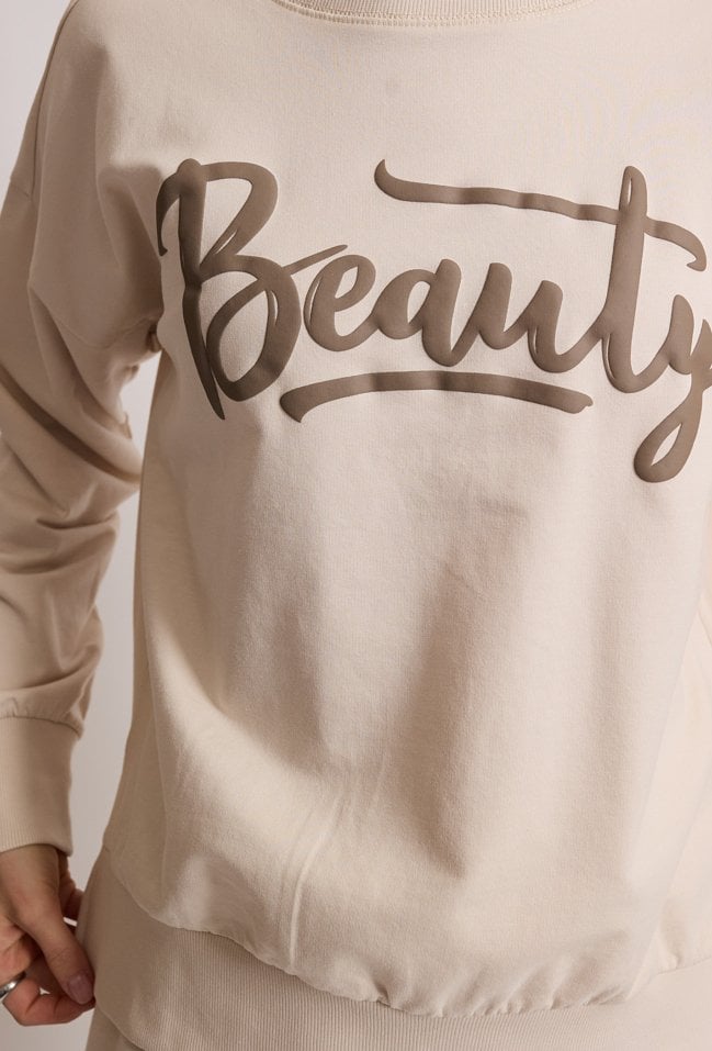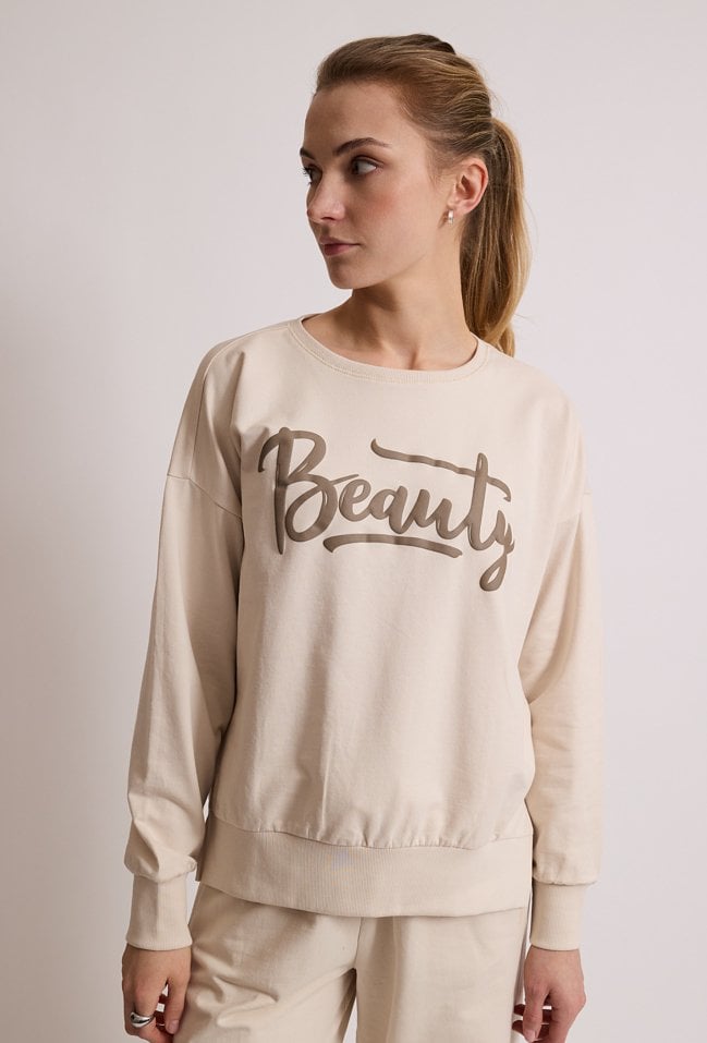 Stylowa bluza damska o luźnym kroju z długim rękawem. Model z okrągłym dekoltem oraz efektownym napisem z przodu, który nadaje całości nowoczesnego charakteru. Bluza doskonale sprawdzi się w codziennych i casualowych stylizacjach, zapewniając komfort i modny wygląd. Modelka na zdjęciu ma 177 cm wzrostu i prezentuje rozmiar S.