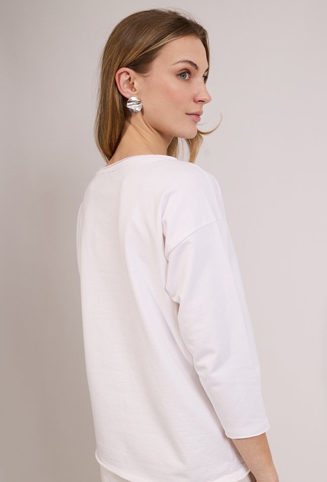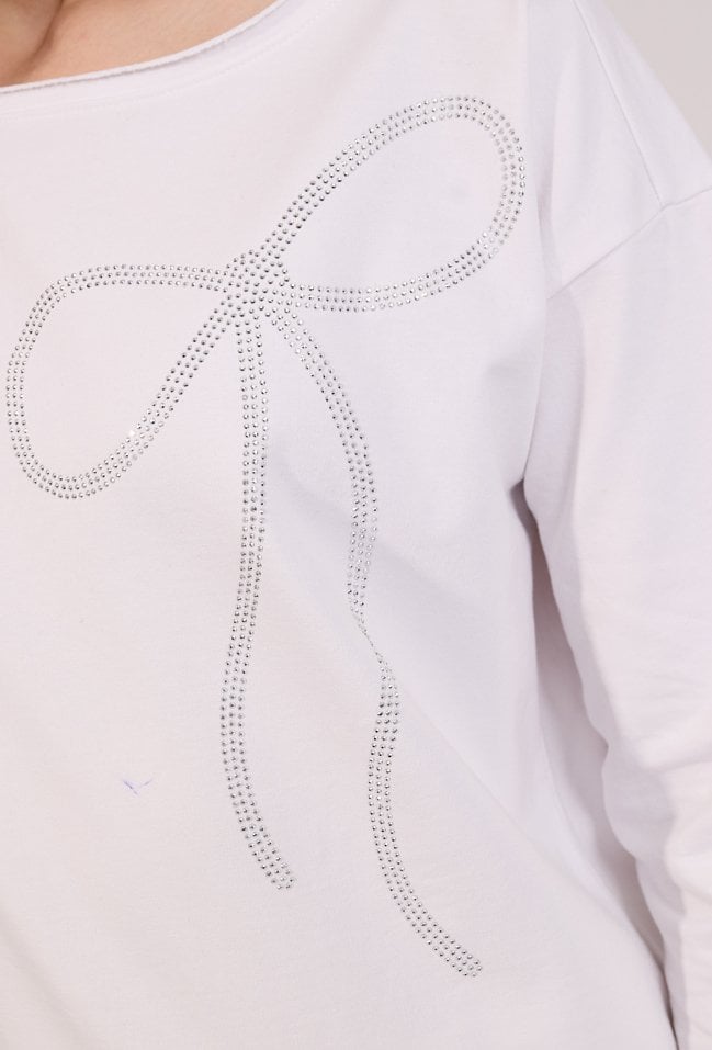 Stylowa bluza damska o luźnym kroju z długim rękawem. Model z okrągłym dekoltem oraz subtelnym zdobieniem w formie kokardy, które nadaje całości delikatnego, kobiecego charakteru. Bluza doskonale sprawdzi się w codziennych i casualowych stylizacjach, zapewniając komfort i wygodę noszenia. Modelka na zdjęciu ma 177 cm wzrostu i prezentuje rozmiar S.