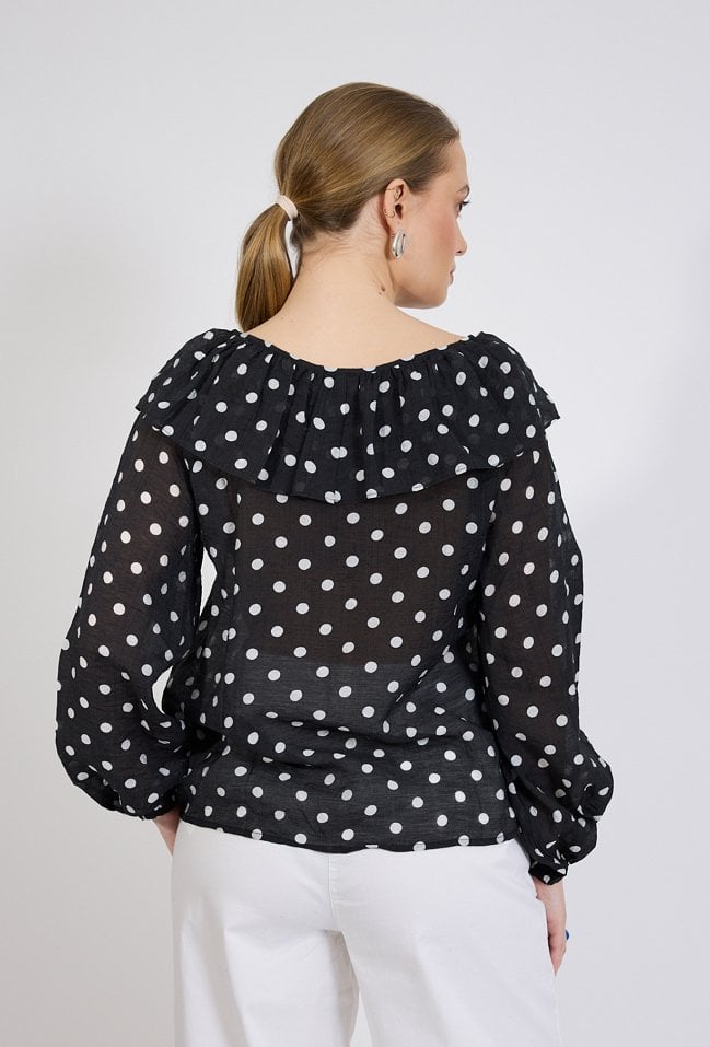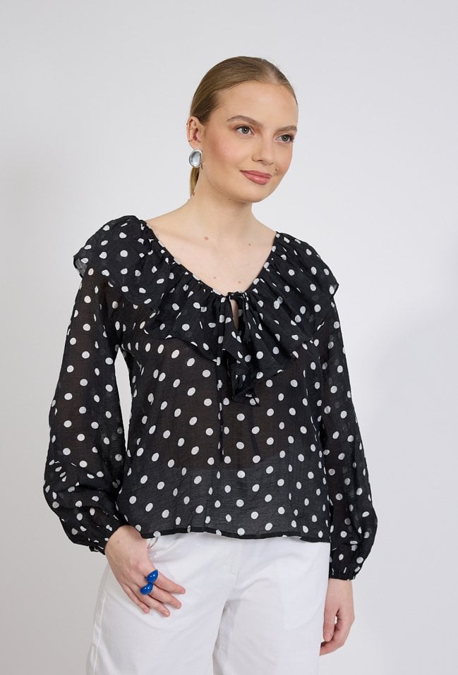 Bluzka damska o lekkim, zwiewnym kroju. Model z długim rękawem zakończonym elastycznym mankietem oraz dekoltem w kształcie litery V z dekoracyjnym wiązaniem. Bluzka damska w kropki doskonale sprawdzi się w codziennych oraz bardziej eleganckich stylizacjach. Modelka na zdjęciu ma 177 cm wzrostu i prezentuje rozmiar 36.