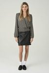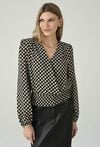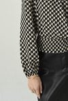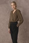 Wyrazista bluzka w czarno-ecru drobny wzór, która pięknie podkreśla sylwetkę i dodaje stylizacji elegancji. Kopertowy przód z dekoltem w kształcie litery V tworzy kobiecą linię, a dopasowanie w talii akcentuje proporcje i nadaje całości lekkiego, szykownego charakteru. Długie rękawy z delikatnym marszczeniem przy mankiecie dodają subtelnej objętości i sprawiają, że model prezentuje się wyjątkowo stylowo. To idealna propozycja do biura, na spotkania i wieczorne wyjścia — świetnie wygląda zarówno ze spódnicą, jak i ze spodniami o podwyższonym stanie.