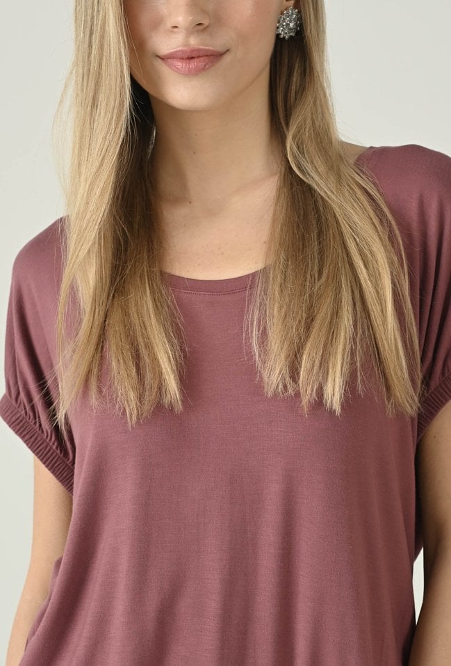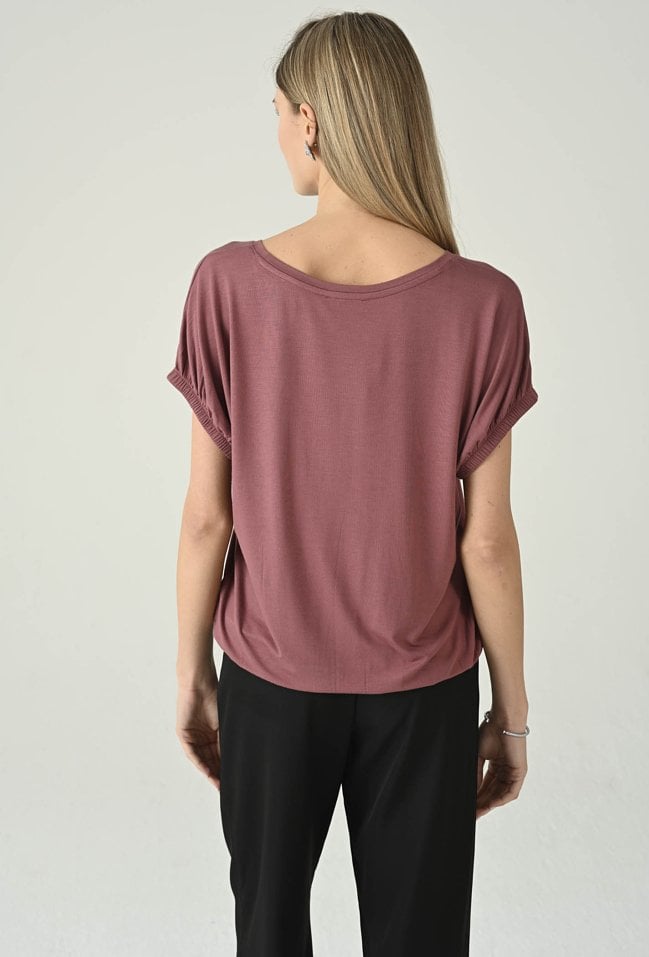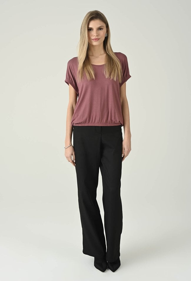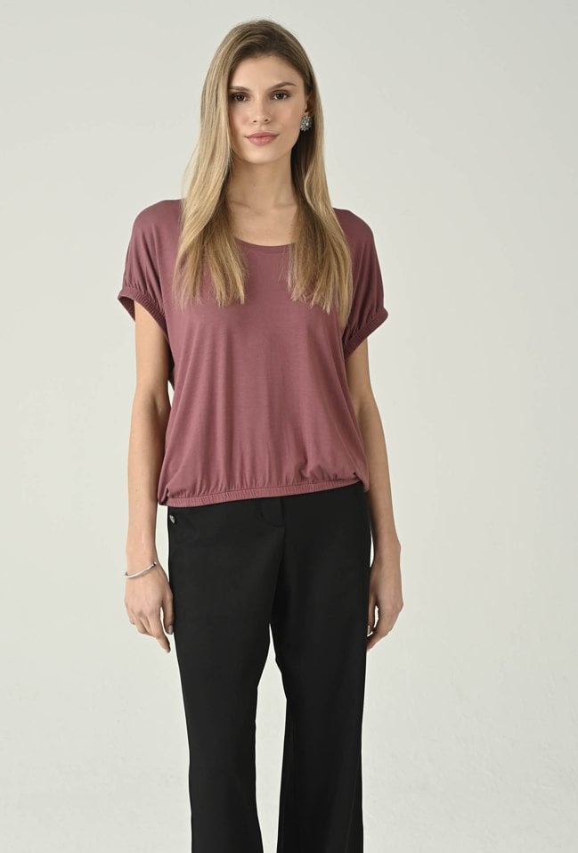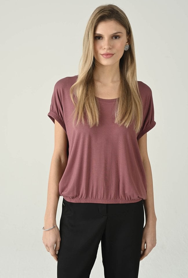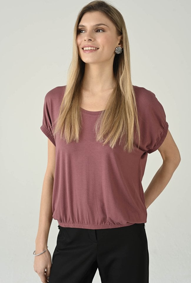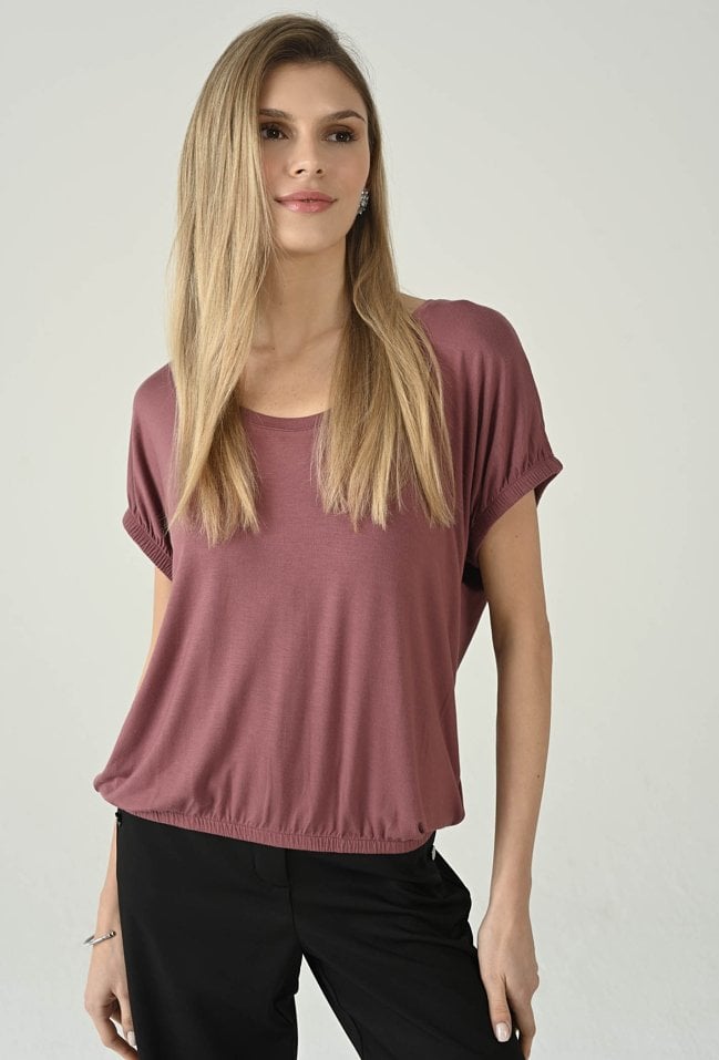 Swobodna bluzka w różowym odcieniu, która łączy wygodę z kobiecą lekkością. Klasyczny dekolt nadaje jej ponadczasowego charakteru, a krótkie rękawy z delikatnym marszczeniem dodają subtelnego efektu i podkreślają dopracowane wykończenie. Elastyczna gumka u dołu sprawia, że bluzka pięknie układa się na sylwetce i pozwala uzyskać lekko „bluzowany” fason bez wysiłku. To idealna propozycja do codziennych stylizacji — świetnie wygląda z jeansami, spodniami materiałowymi i spódnicą, sprawdzając się na co dzień, do pracy i na weekend.