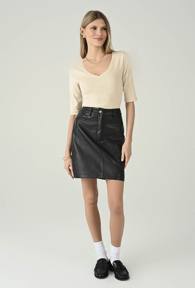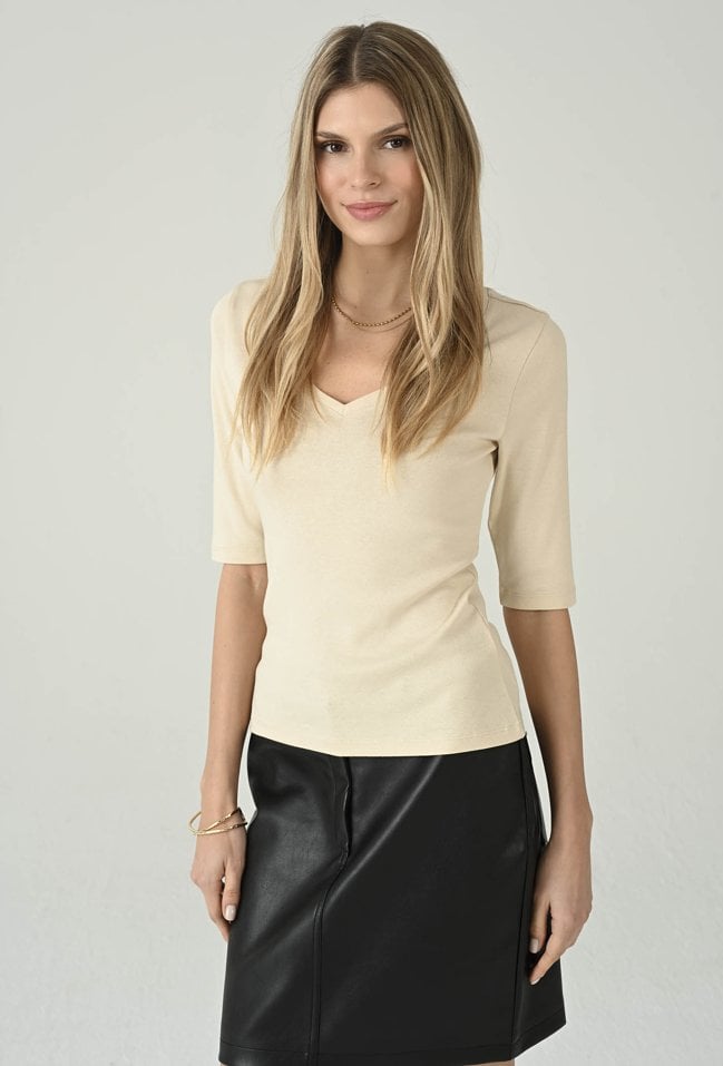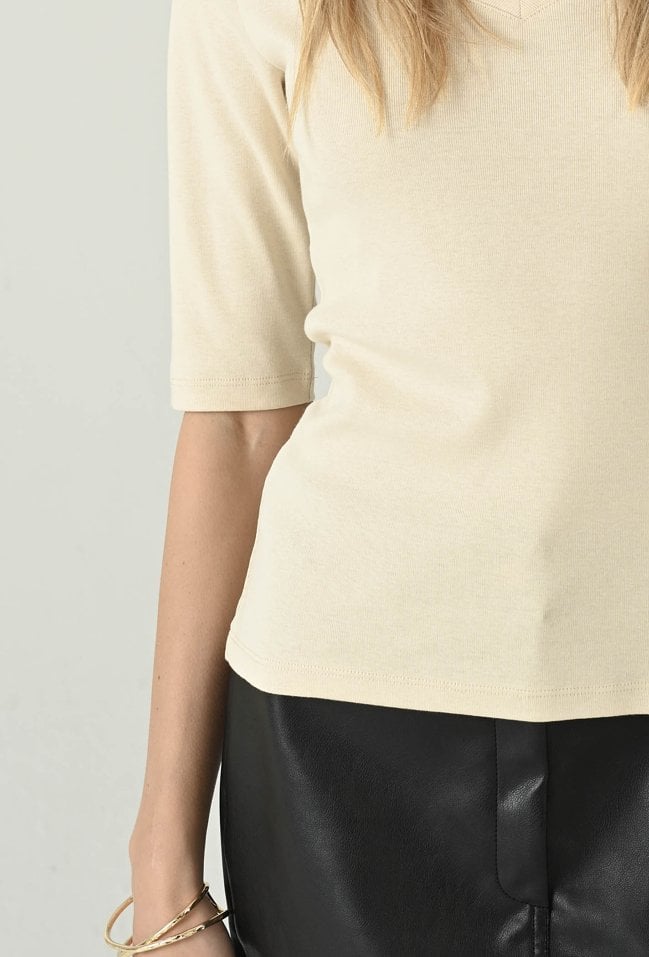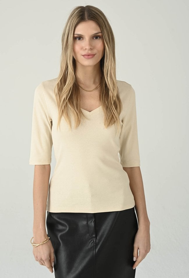 Uniwersalna bluzka w beżowym odcieniu, która łączy codzienny komfort z kobiecą elegancją. Dekolt w kształcie litery V subtelnie podkreśla szyję i optycznie wysmukla górną część sylwetki, a rękaw 3/4 sprawia, że model świetnie sprawdzi się przez cały sezon. Dopasowany fason ładnie układa się na ciele i pozwala swobodnie tworzyć stylizacje — zarówno z jeansami, jak i ze spódnicą czy spodniami materiałowymi. To ponadczasowa baza, po którą będziesz sięgać na co dzień, do pracy i na mniej formalne wyjścia.