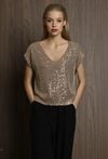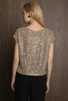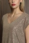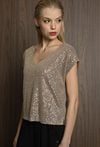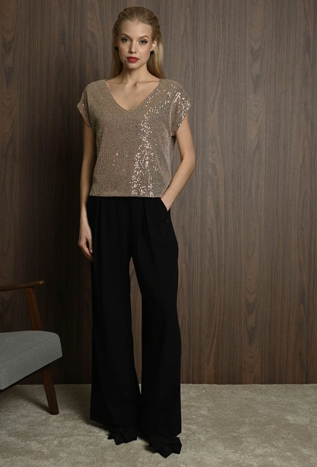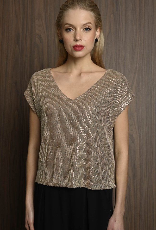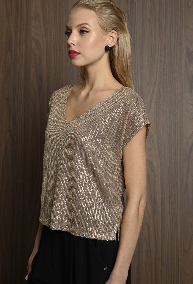 Cekinowa bluzka z krótkim rękawem, która efektownie mieni się w świetle, dodając sylwestrowej stylizacji wyjątkowego blasku. Dekolt w kształcie litery V podkreśla szyję i subtelnie eksponuje dekolt, nadając całości elegancji. Lekki i dopasowany krój sprawia, że bluzka świetnie komponuje się zarówno ze spódnicami, jak i eleganckimi spodniami. To idealna propozycja na wieczorne wyjścia i imprezy, które wymagają nieco więcej szyku i błysku. Modelka na zdjęciu ma 177 cm wzrostu i prezentuje rozmiar 36.