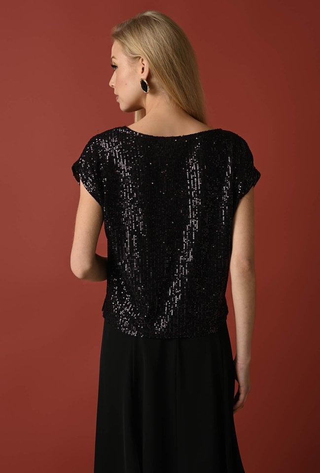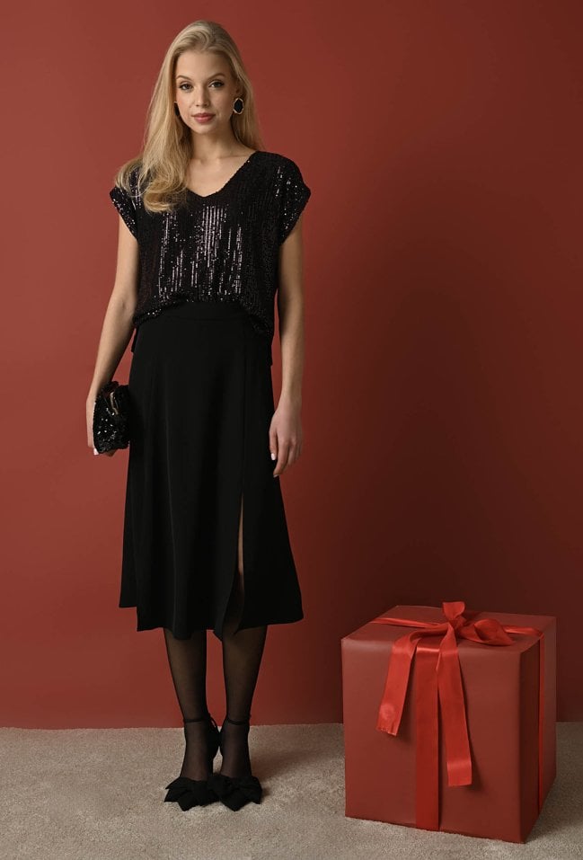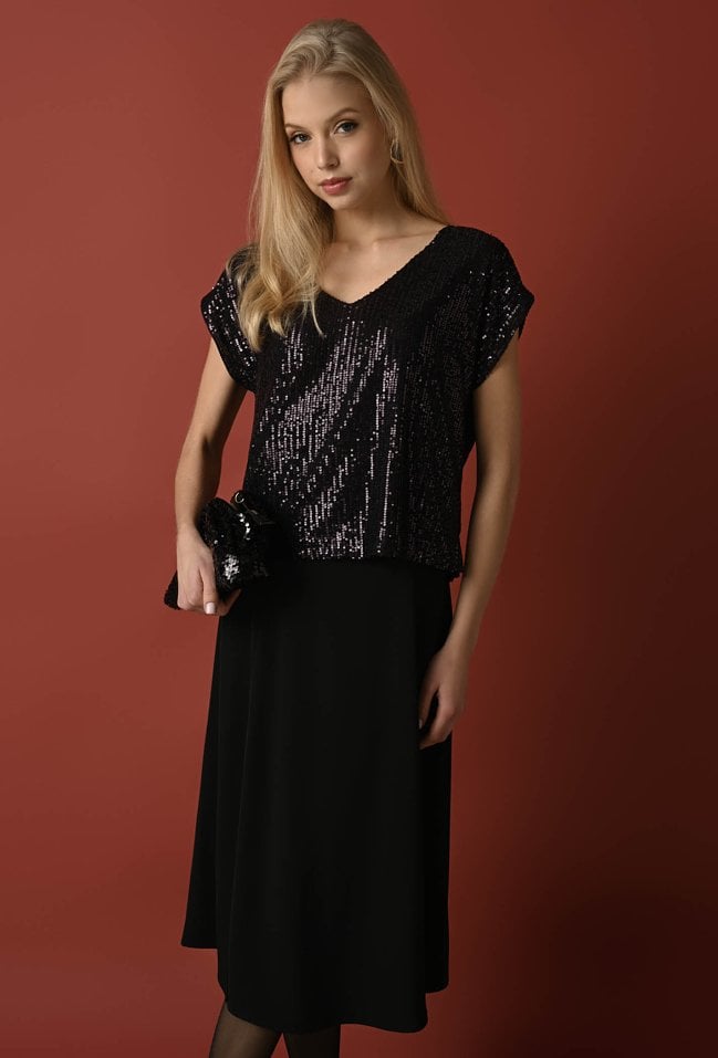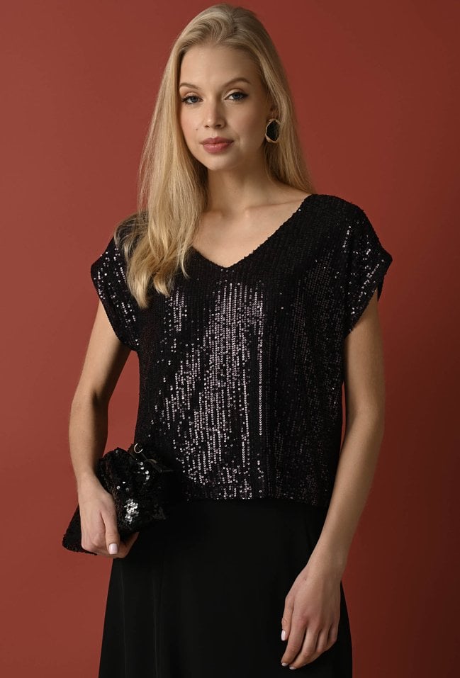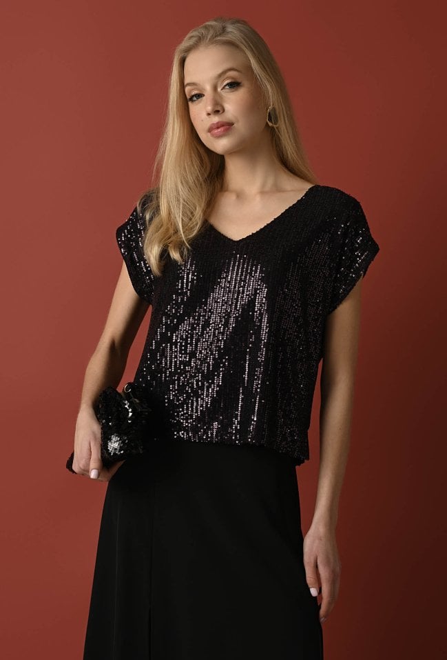 Cekinowa bluzka z krótkim rękawem, która efektownie mieni się w świetle, dodając sylwestrowej stylizacji wyjątkowego blasku. Dekolt w kształcie litery V podkreśla szyję i subtelnie eksponuje dekolt, nadając całości elegancji. Lekki i dopasowany krój sprawia, że bluzka świetnie komponuje się zarówno ze spódnicami, jak i eleganckimi spodniami. To idealna propozycja na wieczorne wyjścia i imprezy, które wymagają nieco więcej szyku i błysku. Modelka na zdjęciu ma 177 cm wzrostu i prezentuje rozmiar S.