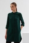 Długa koszula damska w kolorze butelkowej zieleni z kołnierzykiem , zapinana po długości na guziki. Sukienka posiada długie rękawy z możliwością regulacji. Kieszenie po bokach dodają funkcjonalności sukience-sprawdzi się idealnie na co dzień jako baza stylizacji. Modelka na zdjęciu ma 175cm wzrostu i prezentuje rozmiar S.