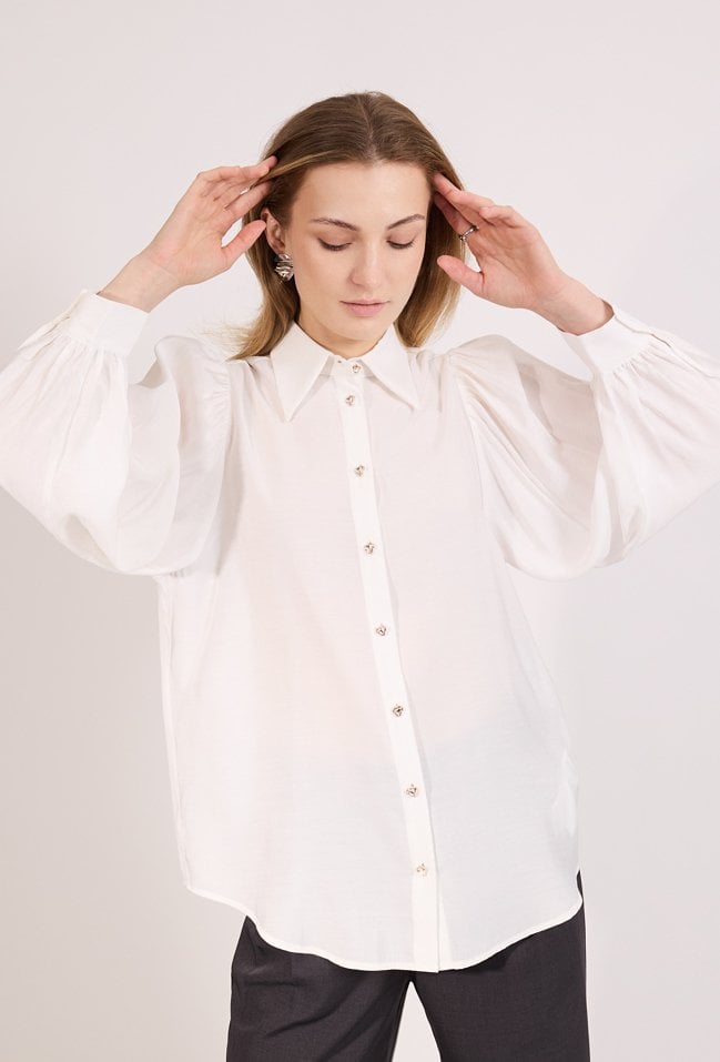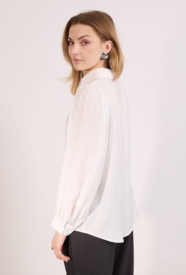 Elegancka koszula damska o klasycznym kroju z długim rękawem. Model zapinany na guziki z kołnierzykiem, ozdobiony subtelnymi detalami, które nadają stylizacji kobiecego charakteru. Koszula doskonale sprawdzi się w eleganckich i biznesowych stylizacjach, do pracy oraz na spotkania. Modelka na zdjęciu ma 177 cm wzrostu i prezentuje rozmiar 36.