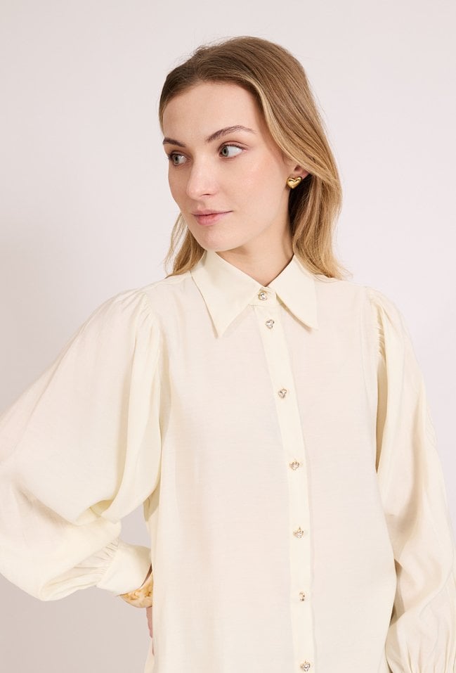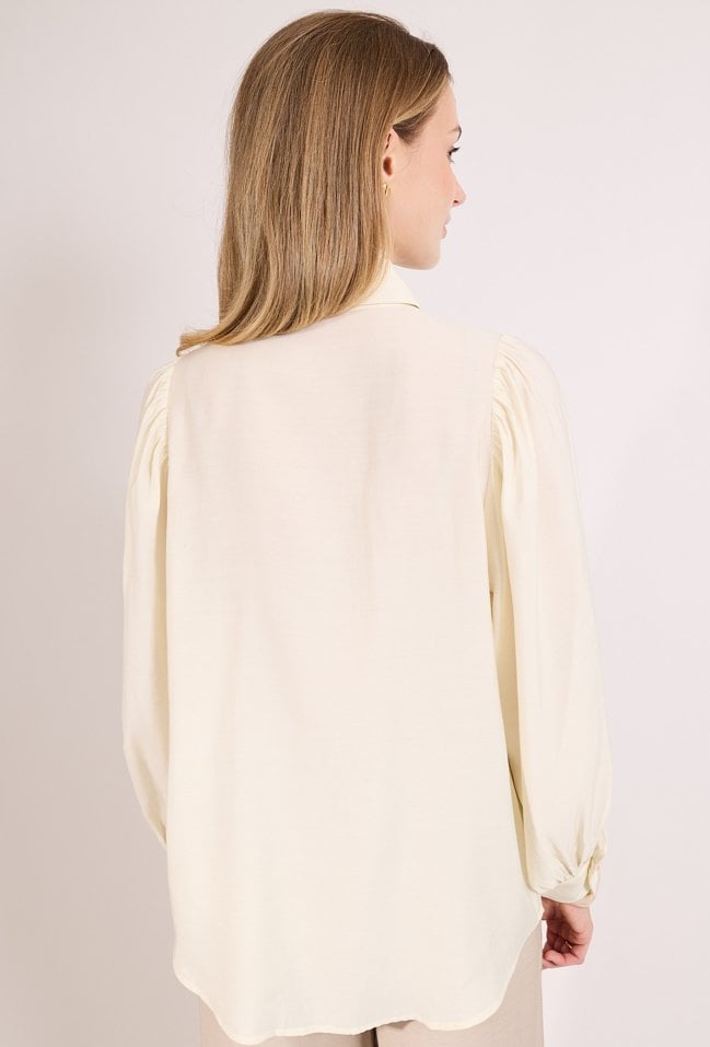 Elegancka koszula damska o klasycznym kroju z długim rękawem. Model zapinany na guziki z kołnierzykiem, ozdobiony subtelnymi detalami, które nadają stylizacji kobiecego charakteru. Koszula doskonale sprawdzi się w eleganckich i biznesowych stylizacjach, do pracy oraz na spotkania. Modelka na zdjęciu ma 177 cm wzrostu i prezentuje rozmiar 36.