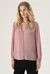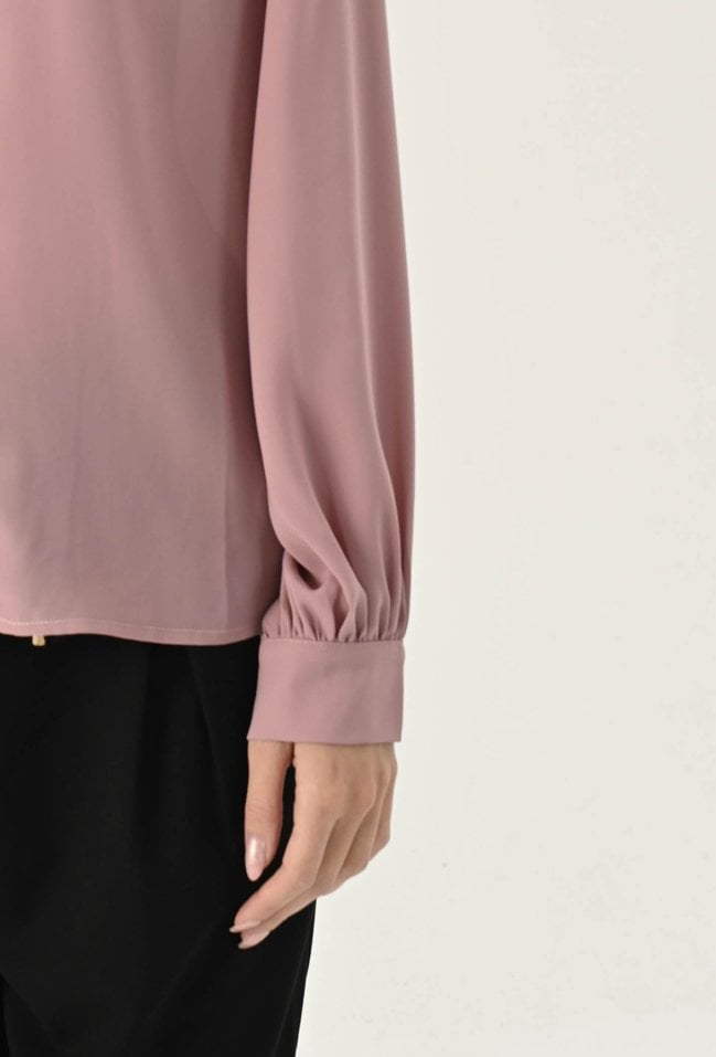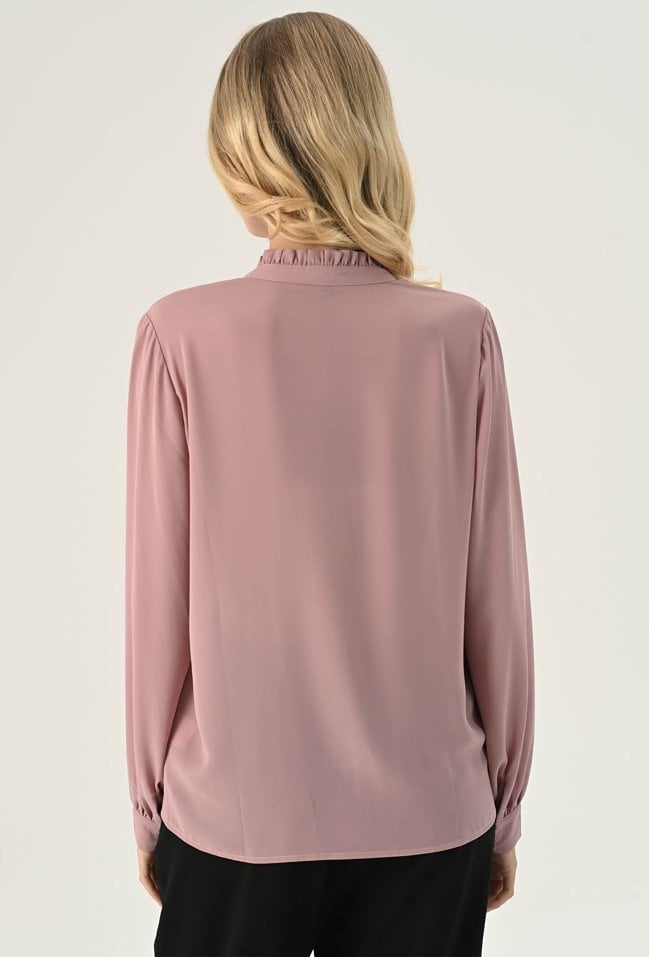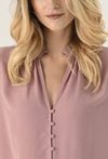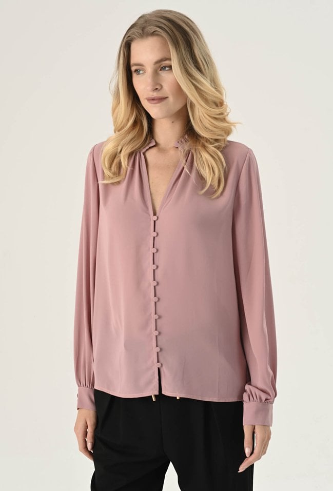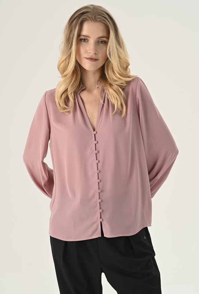 Elegancka bluzka w pudrowym kolorze zakończonym szerokim mankietem. Dekolt w kształcie litery V, zapinana na eleganckie, ozdobne guziki, która dodaje jej z dodają jej kobiecego szyku. Wykonana z lekkiej tkaniny, jest wyjątkowo szykowną propozycją do eleganckich zestawów a wysoko kontrastowy wzór idealnie dopełni każdą stylizację. Modelka na zdjęciu ma 174 cm wzrostu i prezentuje rozmiar 36.