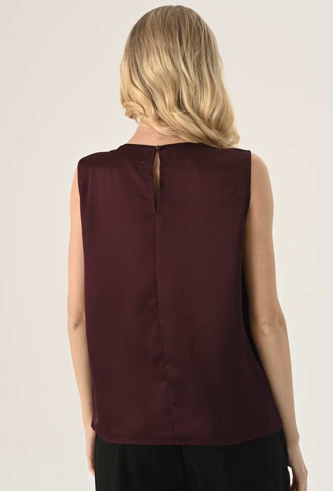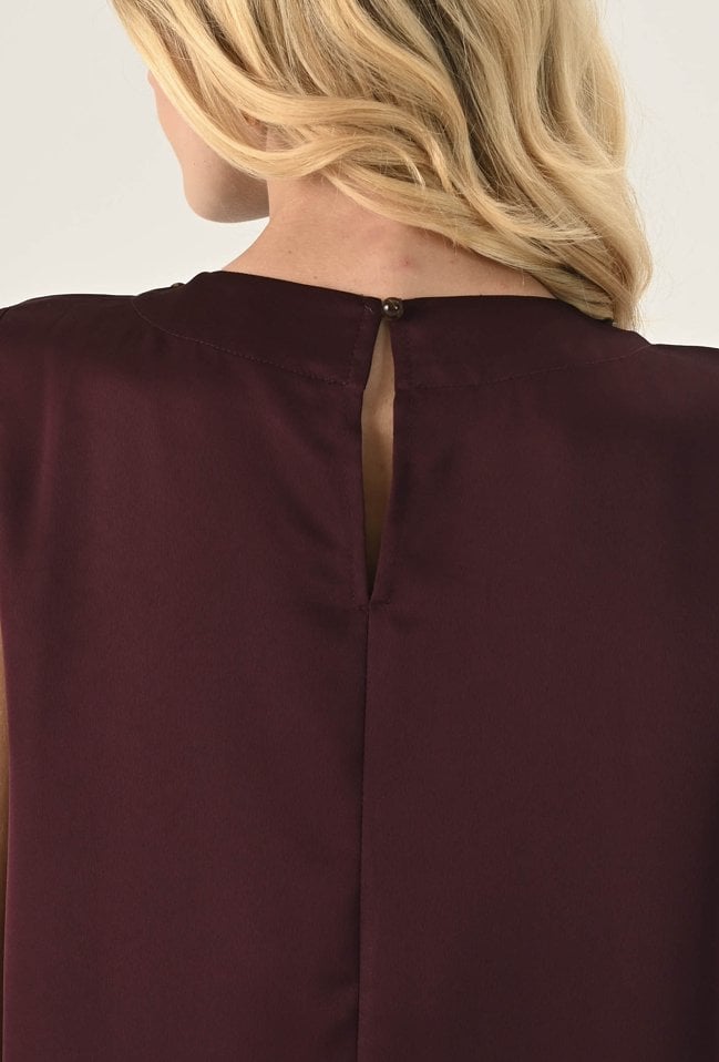 Gładka elegancka bluzka w pięknym kolorze cherry. Wykonana z miękkiego, przyjemnego w dotyku materiału o gładkiej strukturze. Szlachetny kolor dodaje jej elegancji i ponadczasowego charakteru, pozwalając na tworzenie wielu stylowych zestawień kolorystycznych. Minimalistyczny, prosty krój, który doskonale układa się na sylwetce. Subtelna stójka z ozdobnymi koralami przy dekolcie dodaje całości wyrafinowanego charakteru i wprowadza elegancki akcent. Lekka konstrukcja bez rękawów sprawia, że bluzka jest idealna zarówno solo, jak i w zestawieniu z marynarką czy żakietem. Doskonale sprawdzi się w stylizacjach biurowych, koktajlowych i wieczorowych. Modelka na zdjęciu ma 177 cm wzrostu i nosi rozmiar 36.