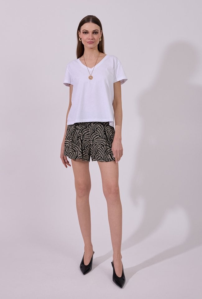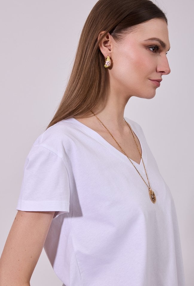 T-shirt damski o prostym, klasycznym kroju z krótkim rękawem. Model z dekoltem w kształcie litery V, który subtelnie podkreśla linię szyi i dodaje całości lekkości. Uniwersalny fason sprawia, że doskonale sprawdzi się jako baza wielu stylizacji. Modelka na zdjęciu ma 177 cm wzrostu i prezentuje rozmiar S.