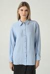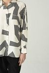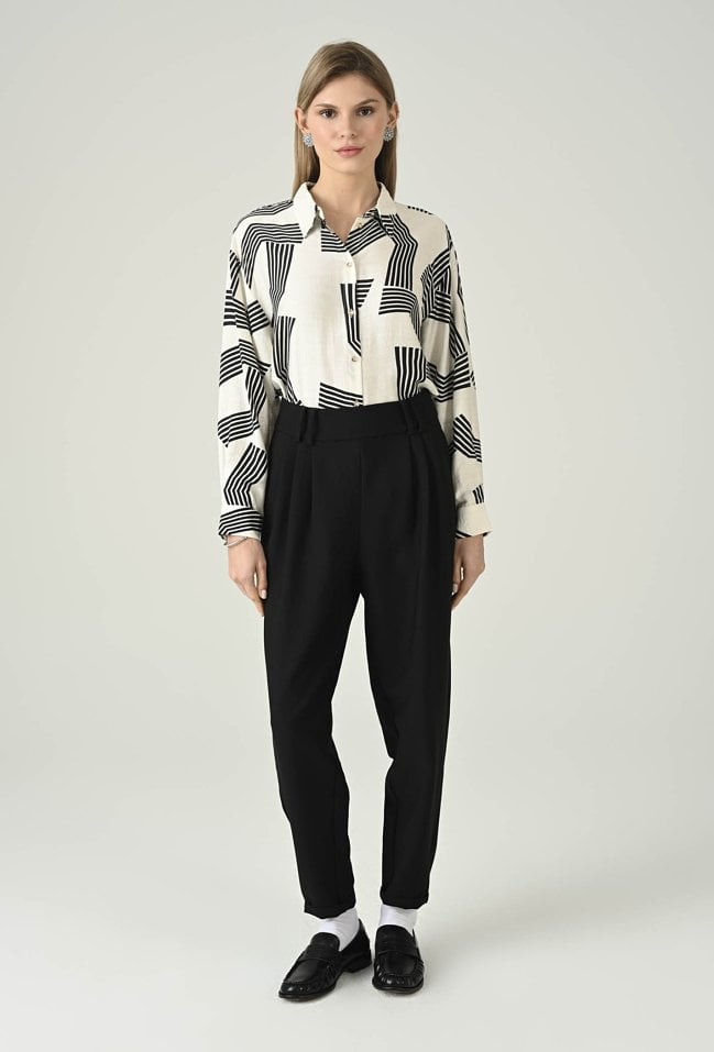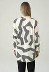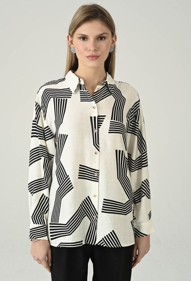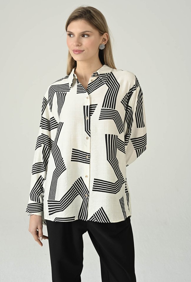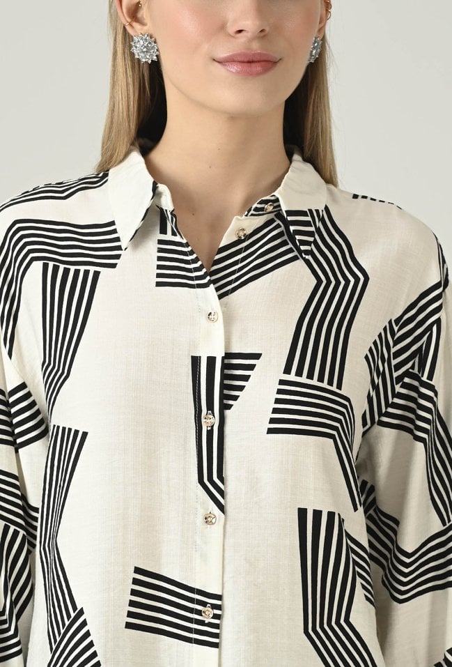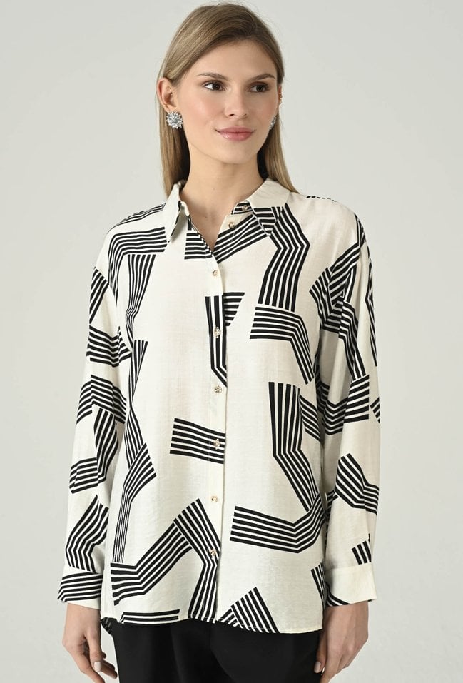 Efektowna koszula o klasycznym kroju z kołnierzykiem, która łączy elegancję z wygodą. Kontrastowy, geometryczny wzór przyciąga wzrok i nadaje stylizacji nowoczesnego charakteru, a zapięcie na guziki pozwala nosić ją zarówno solo, jak i narzuconą na top. Długie rękawy z mankietami dodają całości szyku, a luźniejszy fason zapewnia swobodę ruchów. Świetnie sprawdzi się do spodni materiałowych, jeansów i spódnic – na co dzień, do biura i na wyjścia.