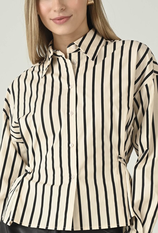 Stylowa koszula w pionowe paski, która dodaje sylwetce lekkości i optycznie ją wydłuża. Klasyczny kołnierzyk oraz zapięcie na guziki podkreślają ponadczasową elegancję, a długie rękawy z mankietami nadają całości dopracowanego charakteru. Fason jest wygodny, a jednocześnie prezentuje się bardzo schludnie — świetnie układa się zarówno wpuszczony w spodnie, jak i noszony luźniej. To uniwersalny wybór do pracy, na spotkania i na co dzień – pasuje do cygaretek, jeansów oraz spódnic.