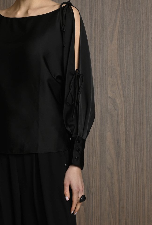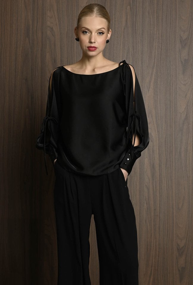 Satynowa bluzka o luźnym, nietoperzowym kroju, która zapewnia swobodę ruchów i modny wygląd. Posiada przecięcia na rękawach, które można wiązać, co dodaje całości elegancji i oryginalnego charakteru. To wygodna i stylowa propozycja na co dzień oraz na bardziej formalne okazje. Modelka na zdjęciu ma 177 cm wzrostu i prezentuje rozmiar 36.