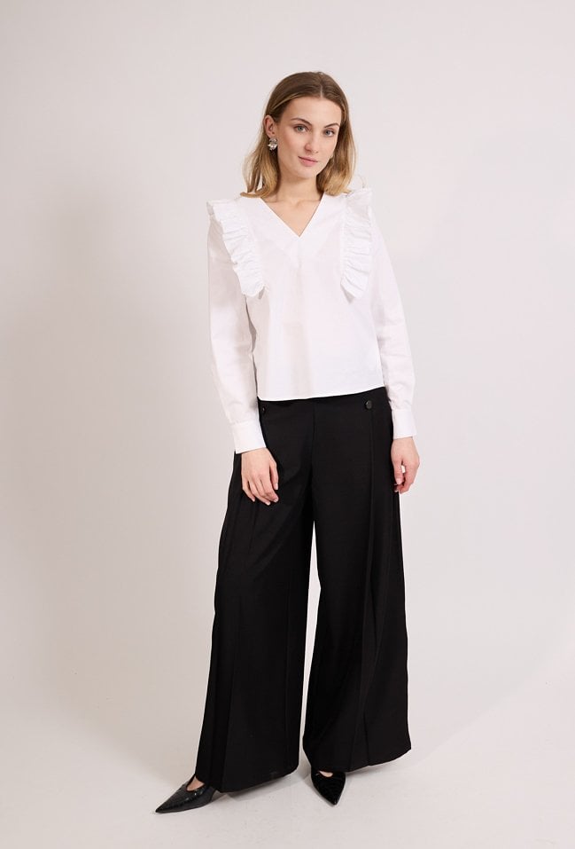 Stylowa bluzka damska o luźnym kroju z długim rękawem. Model z dekoltem w kształcie litery V oraz ozdobnymi falbanami, które nadają stylizacji kobiecego charakteru. Bluzka doskonale sprawdzi się w eleganckich i codziennych stylizacjach, do pracy oraz na spotkania. Modelka na zdjęciu ma 177 cm wzrostu i prezentuje rozmiar 36.
