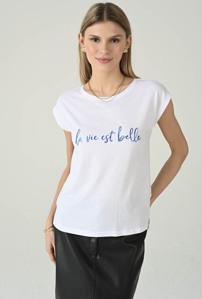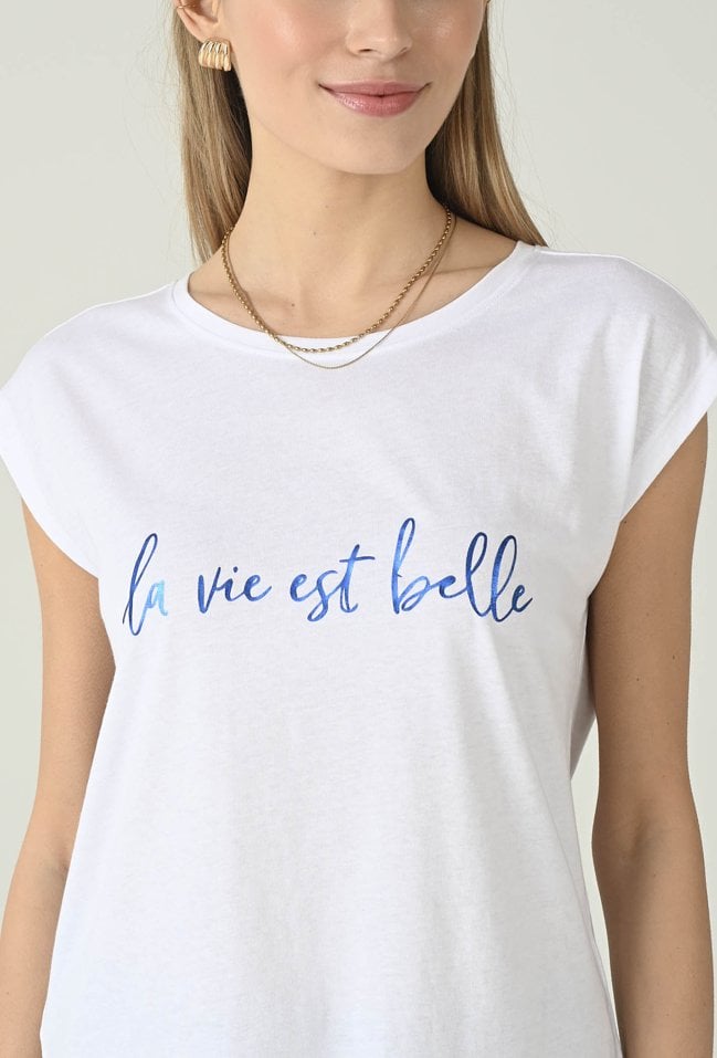 T-shirt damski o prostym, swobodnym kroju. Model z krótkim rękawem i klasycznym, okrągłym dekoltem. Przód zdobi napis „la vie est belle” w kontrastowym kolorze, który nadaje całości modnego, casualowego charakteru. T-shirt damski z napisem doskonale sprawdzi się w codziennych stylizacjach. Modelka na zdjęciu ma 177 cm wzrostu i prezentuje rozmiar S.