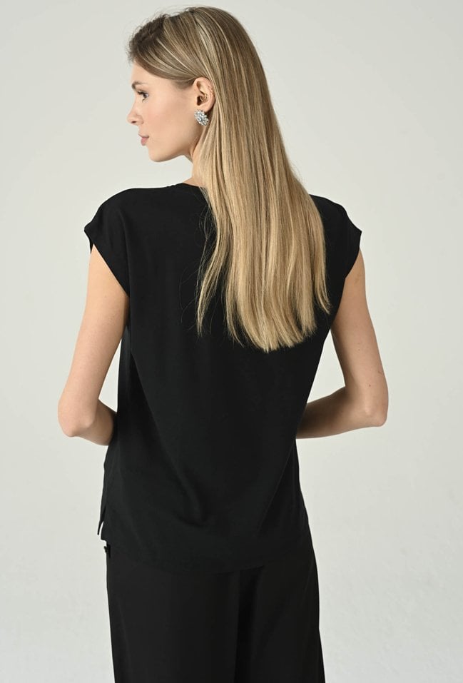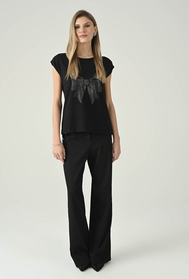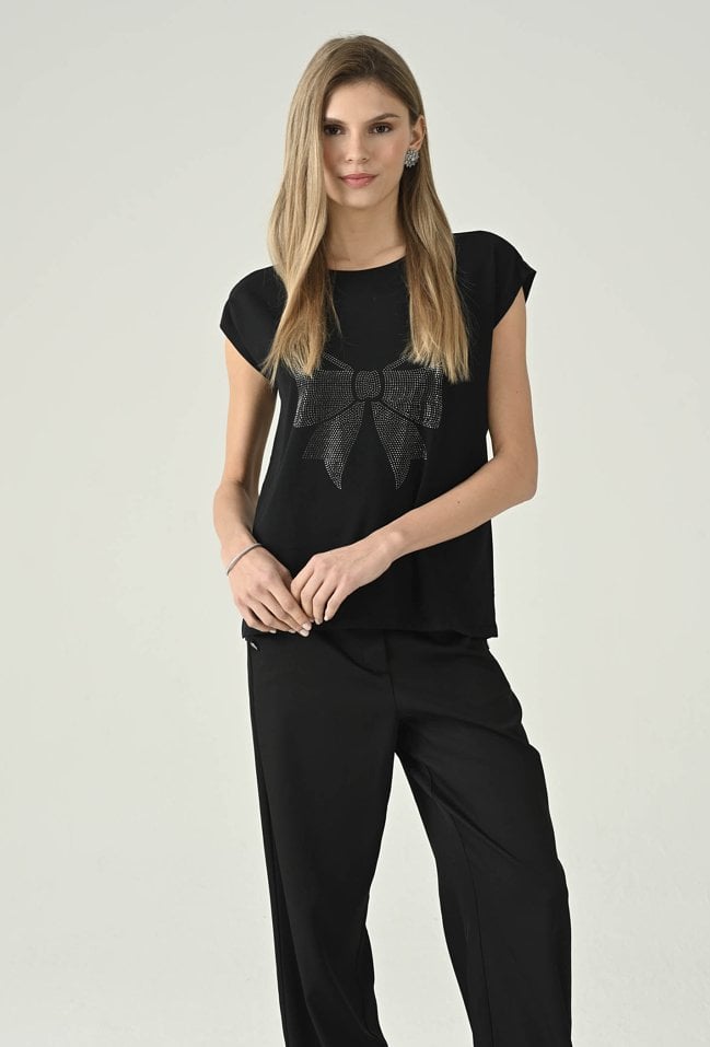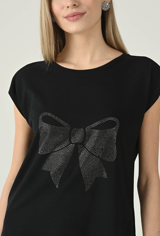 T-shirt damski o prostym, uniwersalnym kroju. Model z krótkim rękawem i klasycznym, okrągłym dekoltem. Przód zdobi efektowna aplikacja w kształcie kokardy z połyskujących dżetów, która nadaje całości eleganckiego charakteru. T-shirt damski z ozdobną aplikacją świetnie sprawdzi się w codziennych oraz bardziej stylowych zestawach. Modelka na zdjęciu ma 177 cm wzrostu i prezentuje rozmiar S.
