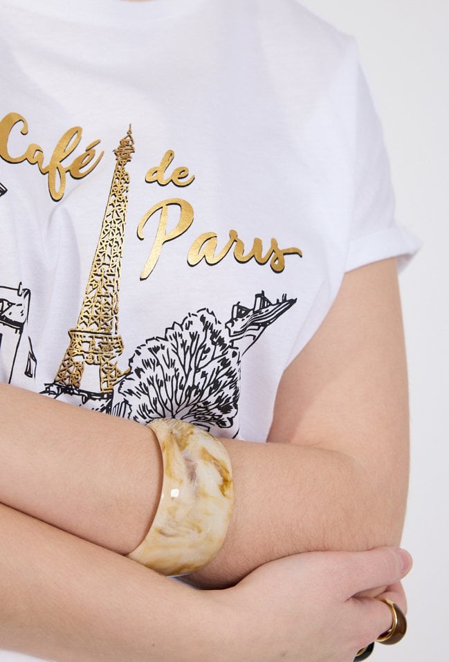 T-shirt damski o swobodnym, komfortowym kroju. Model z krótkim rękawem oraz klasycznym, zaokrąglonym dekoltem. Przód zdobi efektowny nadruk z motywem paryskiej uliczki oraz napisem „Café de Paris”, wzbogacony złotymi detalami, które nadają koszulce eleganckiego charakteru. Modelka na zdjęciu ma 177 cm wzrostu i prezentuje rozmiar S.