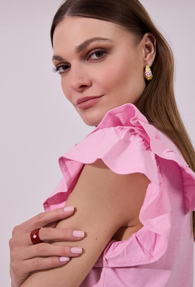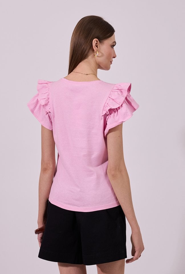 T-shirt damski o dopasowanym kroju z krótkim rękawem. Model z klasycznym, okrągłym dekoltem, ozdobiony efektownymi, falbaniastymi rękawami, które nadają całości kobiecego i stylowego charakteru. Modelka na zdjęciu ma 177 cm wzrostu i prezentuje rozmiar S.