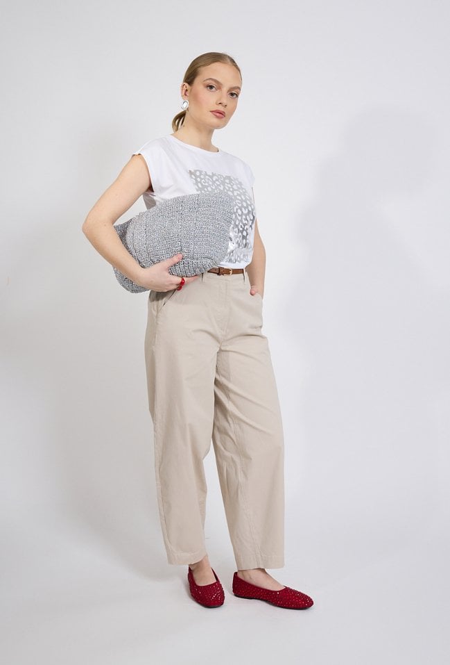 T-shirt damski o swobodnym, komfortowym kroju. Model z krótkim rękawem oraz klasycznym, zaokrąglonym dekoltem. Przód zdobi efektowny nadruk z połyskującym wykończeniem, który nadaje koszulce nowoczesnego i stylowego charakteru. Damski T-shirt doskonale sprawdzi się w codziennych stylizacjach. Modelka na zdjęciu ma 177 cm wzrostu i prezentuje rozmiar S.