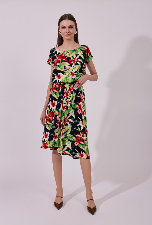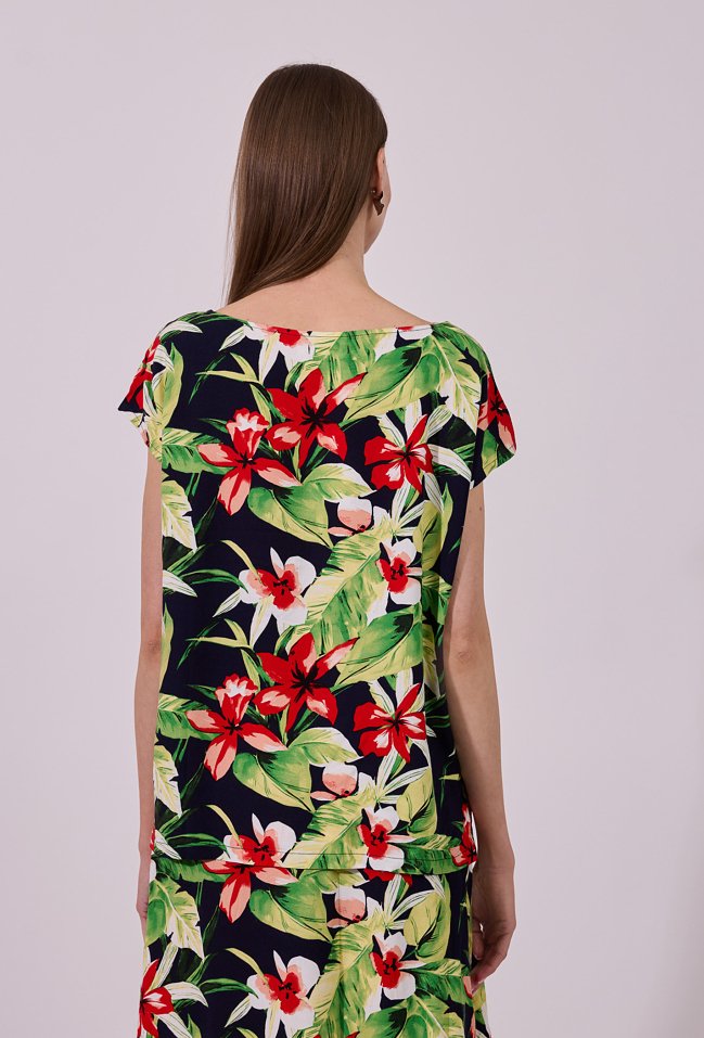 T-shirt damski o luźnym kroju z krótkim rękawem. Model z szerokim, łódkowym dekoltem, który subtelnie podkreśla linię ramion i nadaje całości kobiecego charakteru. T-shirt doskonale sprawdzi się w codziennych i eleganckich stylizacjach, zapewniając komfort i swobodę noszenia. Modelka na zdjęciu ma 177 cm wzrostu i prezentuje rozmiar S.