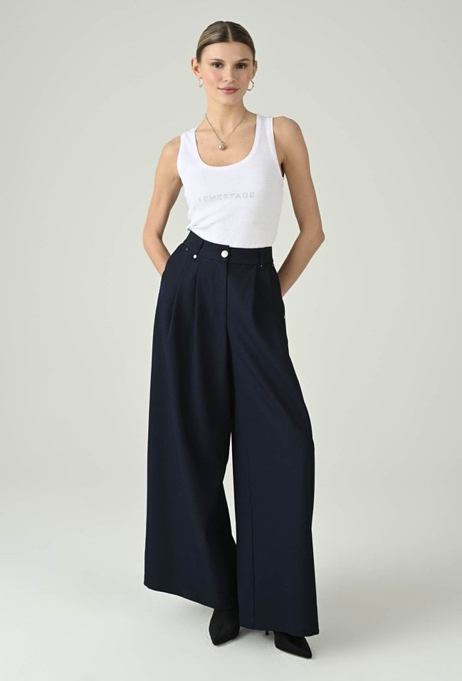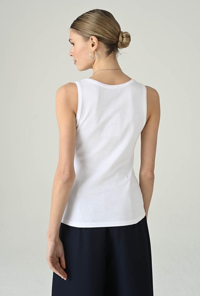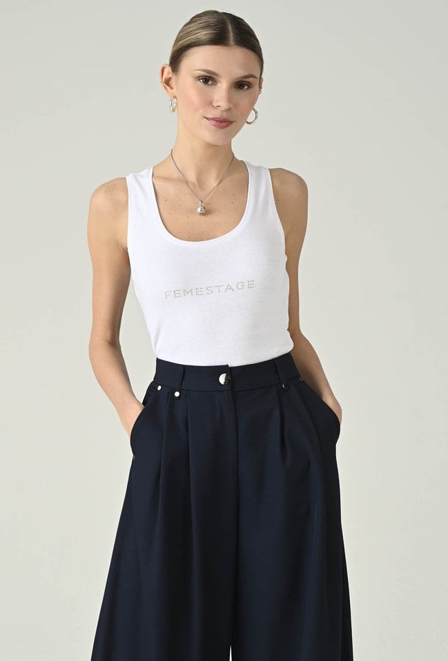Klasyczny biały top bez rękawów, który łączy minimalistyczny styl z delikatnym akcentem brandingowym. Okrągły dekolt i dopasowany fason pięknie układają się na sylwetce, zapewniając wygodę noszenia przez cały dzień. Subtelne logo Femestage na przodzie dodaje całości nowoczesnego charakteru i wyróżnia model w prostych stylizacjach. Top świetnie sprawdzi się zarówno solo w casualowych zestawach, jak i jako baza pod marynarkę, kardigan czy koszulę. To ponadczasowy element garderoby, który łatwo dopasujesz do spodni, spódnic i szortów.