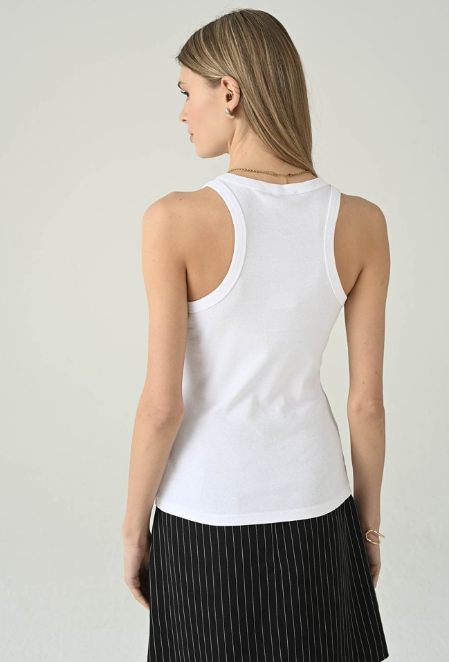 Minimalistyczny biały top bez rękawów, który świetnie sprawdzi się jako uniwersalna baza do wielu stylizacji. Okrągły dekolt nadaje mu klasycznego charakteru, a dopasowany fason ładnie układa się na sylwetce i zapewnia komfort noszenia. Model pięknie prezentuje się solo w letnich zestawach, ale równie dobrze sprawdza się warstwowo — pod marynarką, koszulą lub kardiganem. To ponadczasowy element garderoby, po który chętnie sięgniesz na co dzień, do pracy i na weekendowe wyjścia.