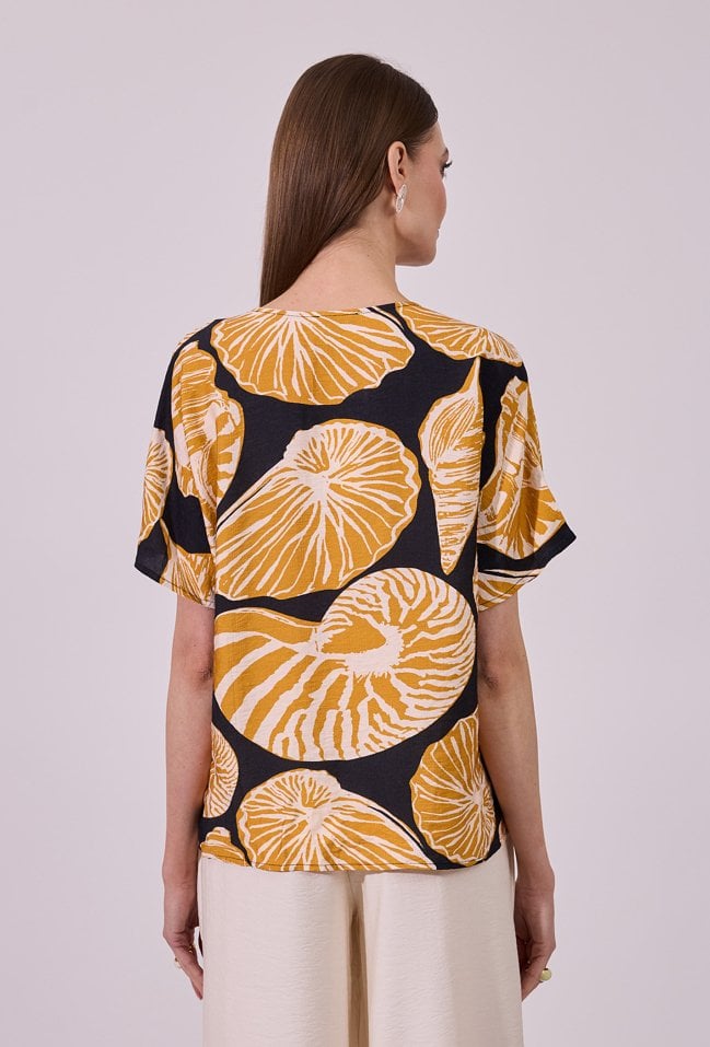 Bluzka damska o luźnym, komfortowym kroju z krótkim rękawem. Model z dekoltem w kształcie litery V, który subtelnie podkreśla linię szyi. Całość zdobi wyrazisty, roślinny wzór, nadający stylizacji nowoczesnego i świeżego charakteru. Modelka na zdjęciu ma 177 cm wzrostu i prezentuje rozmiar S.