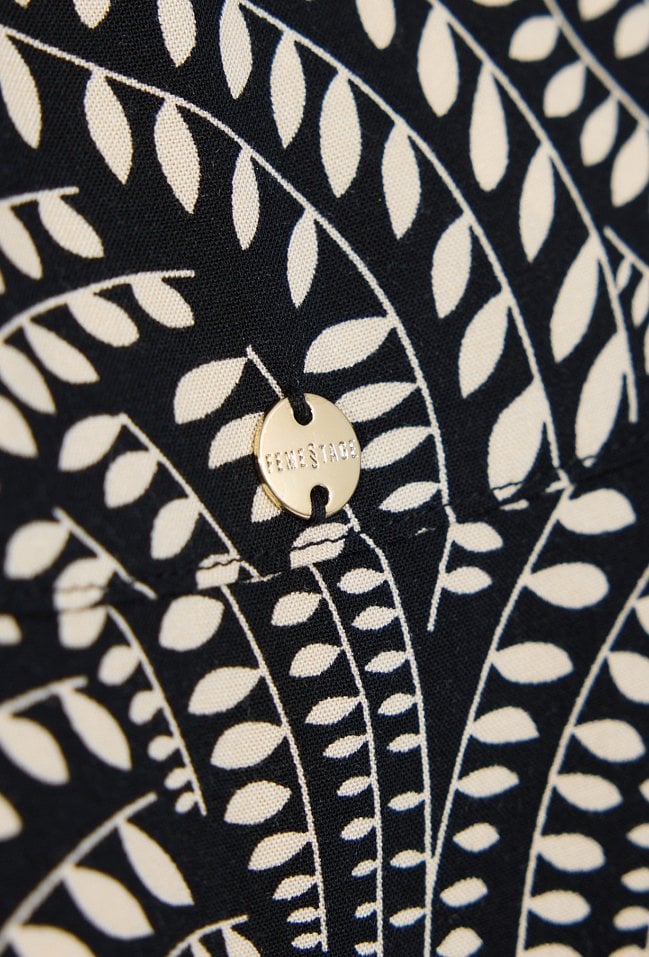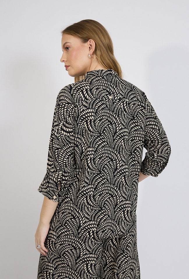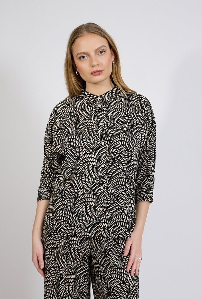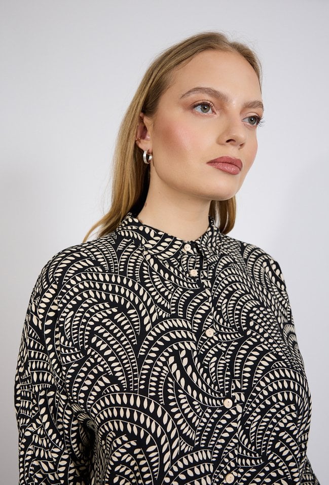 Koszula damska o luźnym, komfortowym kroju. Model z rękawem o długości 3/4 oraz stójką przy dekolcie, zapinany na guziki. Całość zdobi wyrazisty, dekoracyjny wzór, który nadaje stylizacji nowoczesnego i eleganckiego charakteru. Modelka na zdjęciu ma 177 cm wzrostu i prezentuje rozmiar S.