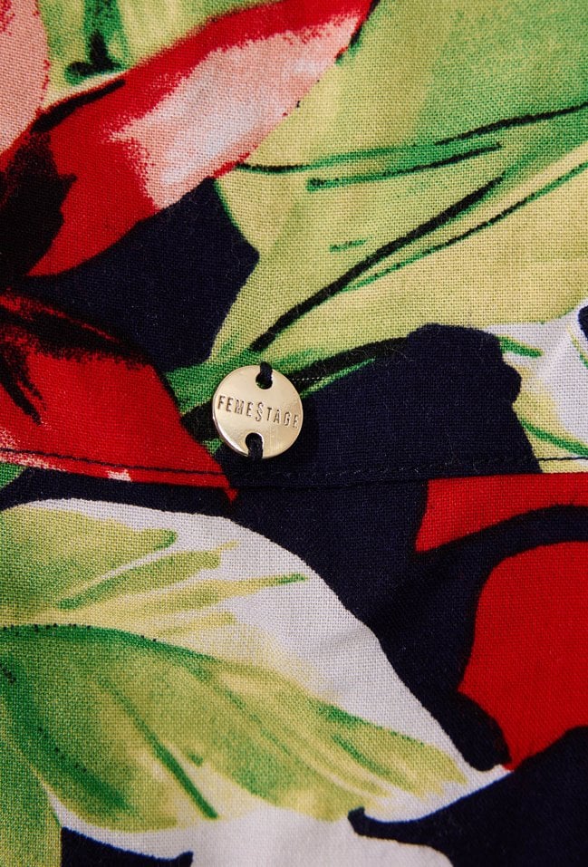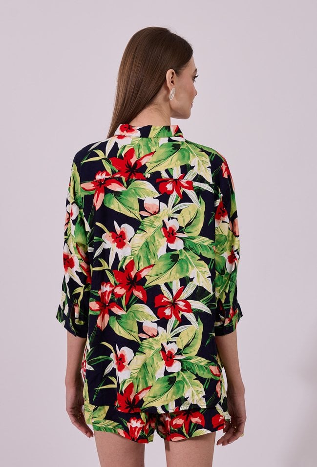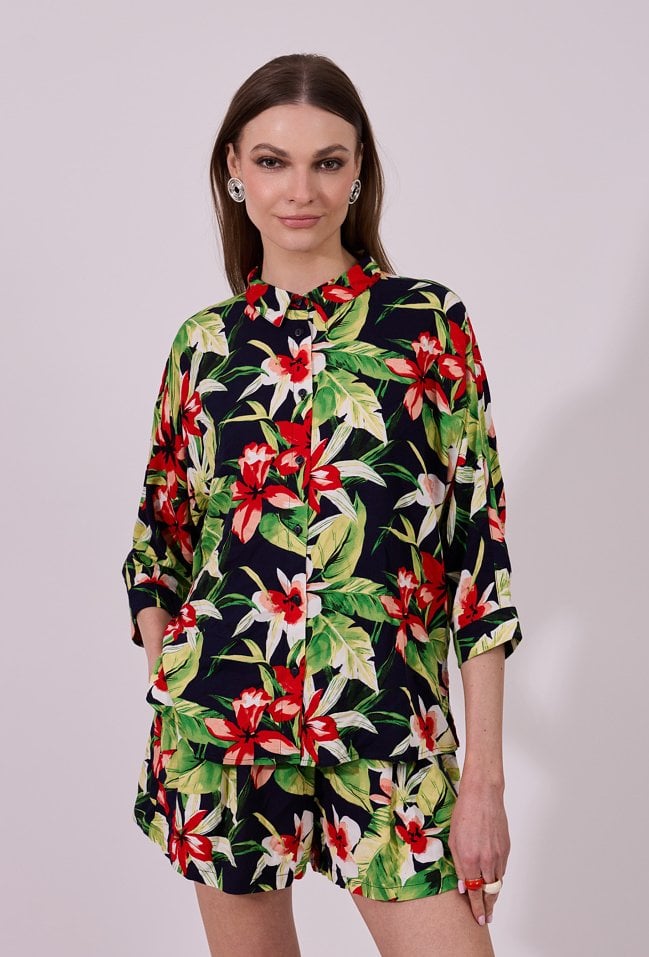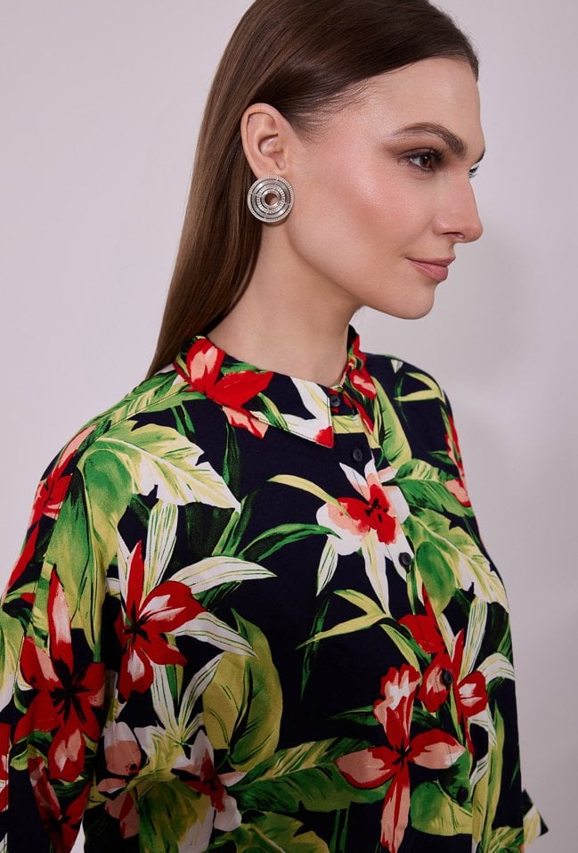 Koszula damska o luźnym, komfortowym kroju. Model z rękawem o długości 3/4 oraz stójką przy dekolcie, zapinany na guziki. Całość zdobi wyrazisty, dekoracyjny wzór, który nadaje stylizacji nowoczesnego i eleganckiego charakteru. Modelka na zdjęciu ma 177 cm wzrostu i prezentuje rozmiar S.