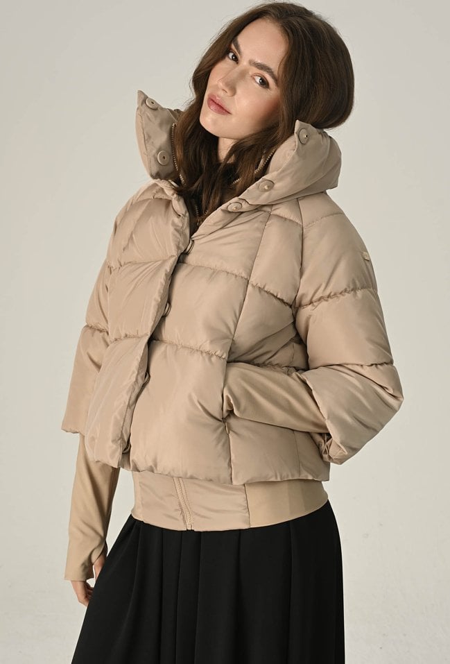 Beżowa pikowana kurtka z wysokim kołnierzem