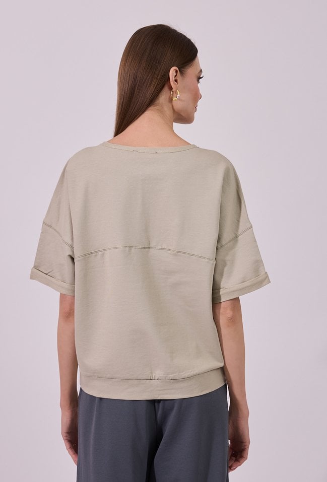 Bluza damska o luźnym, komfortowym kroju z krótkim rękawem. Model z okrągłym dekoltem oraz krótkim zamkiem z przodu, zakończonym ozdobnym kółkiem. Minimalistyczny design sprawia, że bluza doskonale sprawdzi się w codziennych, casualowych stylizacjach. Modelka na zdjęciu ma 177 cm wzrostu i prezentuje rozmiar S.