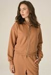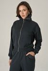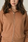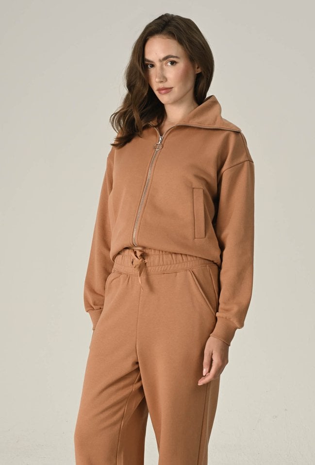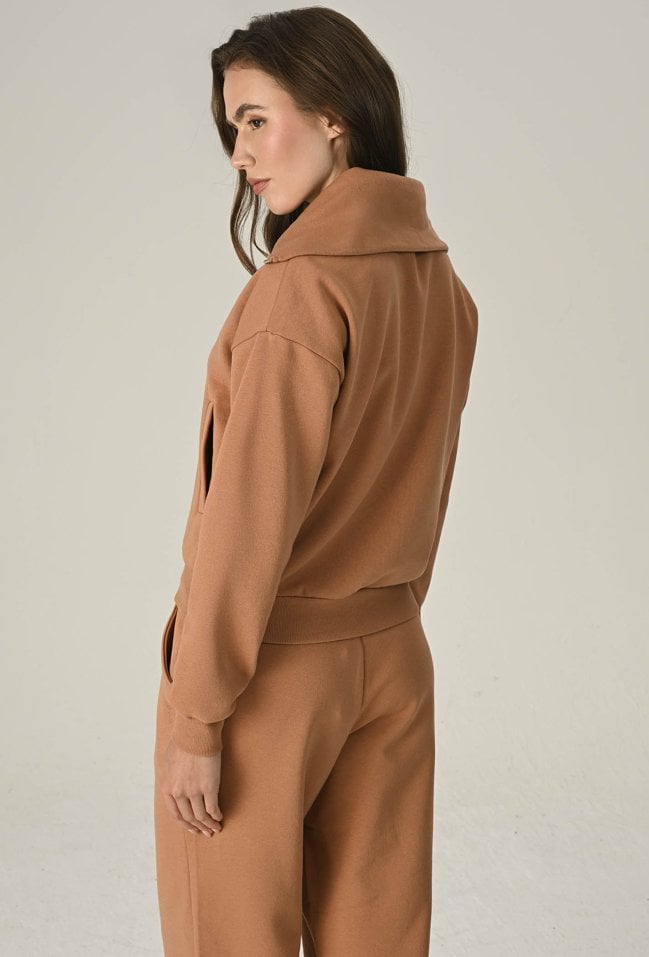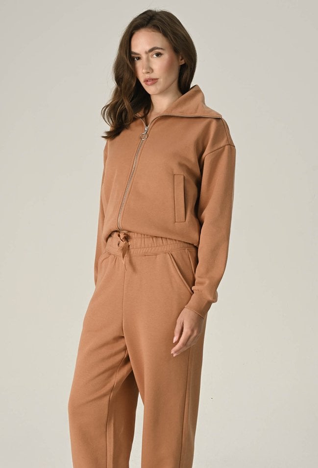 Rozpinana bluza dresowa o krótszym fasonie i wysokim kołnierzem to nowoczesna propozycja dla kobiet ceniących wygodę i styl. Wykonana z miękkiej dzianiny, zapewnia komfort noszenia na co dzień. Wsuwane kieszenie dodają funkcjonalności, a wykończenia ze ściągaczami gwarantują świetne dopasowanie. Idealna do casualowych i sportowych stylizacji. Modelka na zdjęciu ma 173 cm wzrostu i prezentuje rozmiar 36.