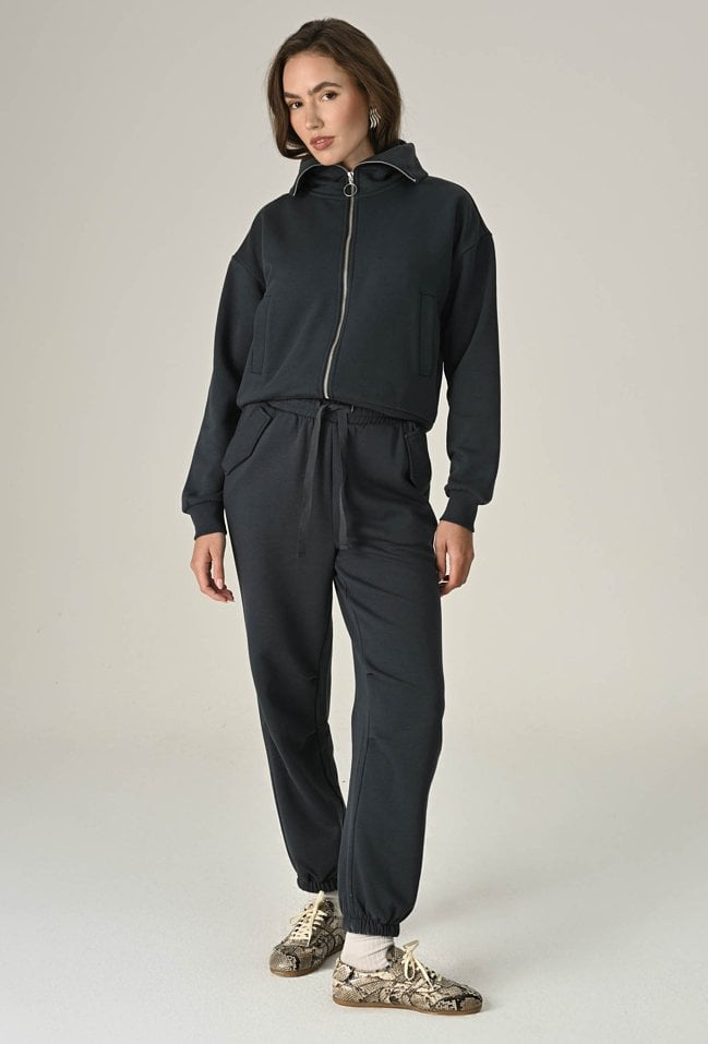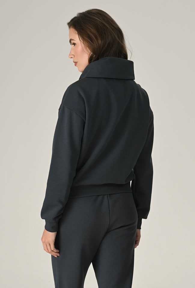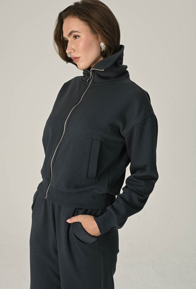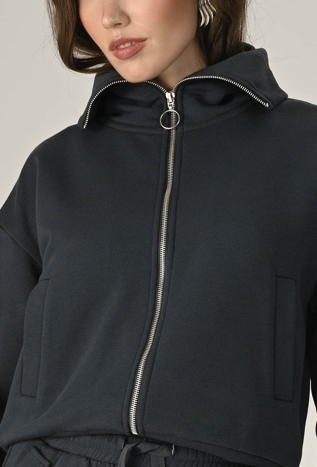 Rozpinana bluza dresowa o krótszym fasonie i wysokim kołnierzem to nowoczesna propozycja dla kobiet ceniących wygodę i styl. Wykonana z miękkiej dzianiny, zapewnia komfort noszenia na co dzień. Wsuwane kieszenie dodają funkcjonalności, a wykończenia ze ściągaczami gwarantują świetne dopasowanie. Idealna do casualowych i sportowych stylizacji. Modelka na zdjęciu ma 173 cm wzrostu i prezentuje rozmiar 36.