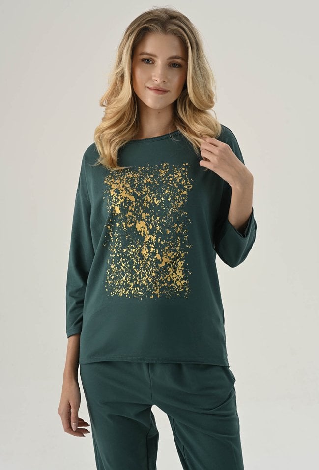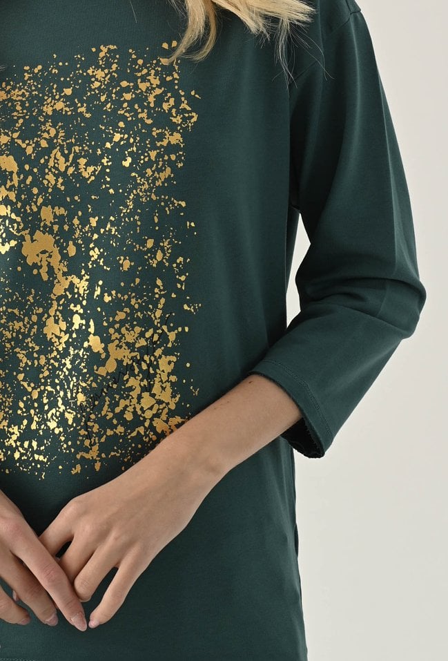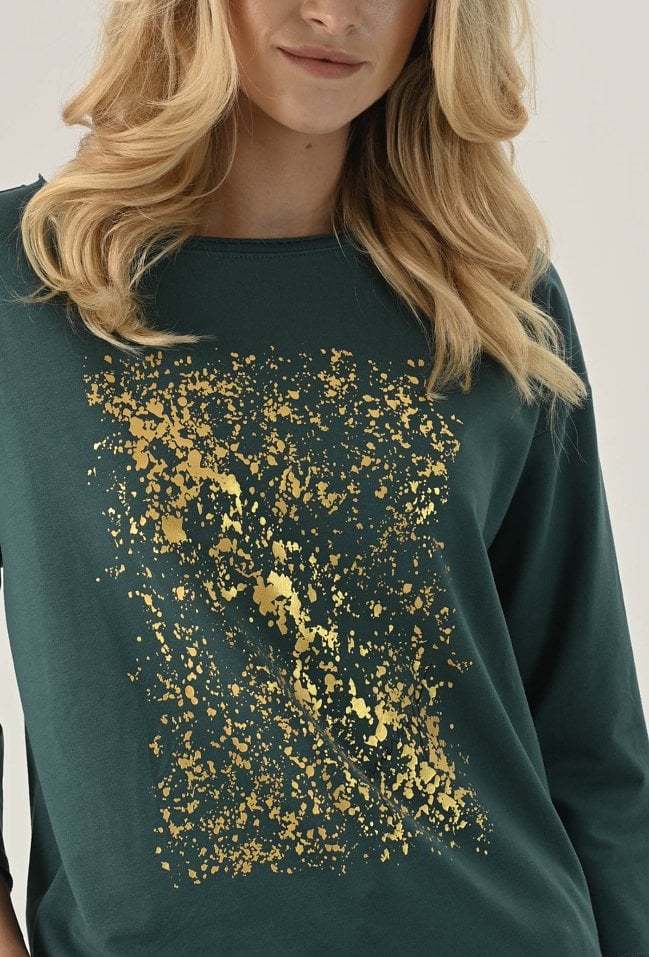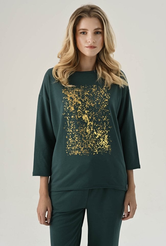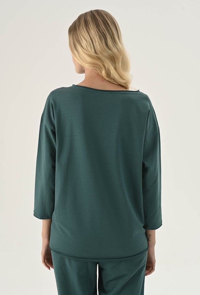 Bawełniana bluza o swobodnym kroju wykonana z miękkiej dzianiny, bawełny. Bluza posiada okrągły dekolt, rękawy o długości 3/4 z obniżoną linią ramion oraz surowe wykończeniem. Front bluzy zdobi złota aplikacja/ Modelka ma 177 cm wzrostu i prezentuje rozmiar S.