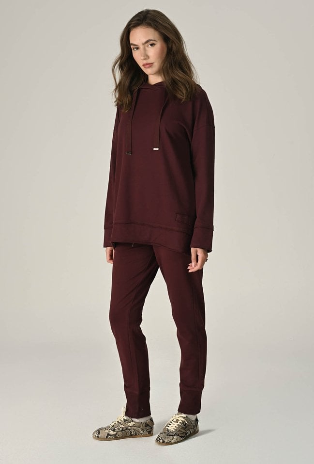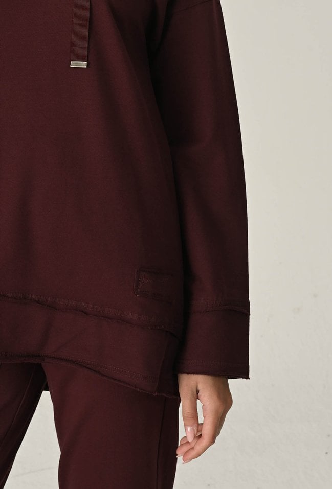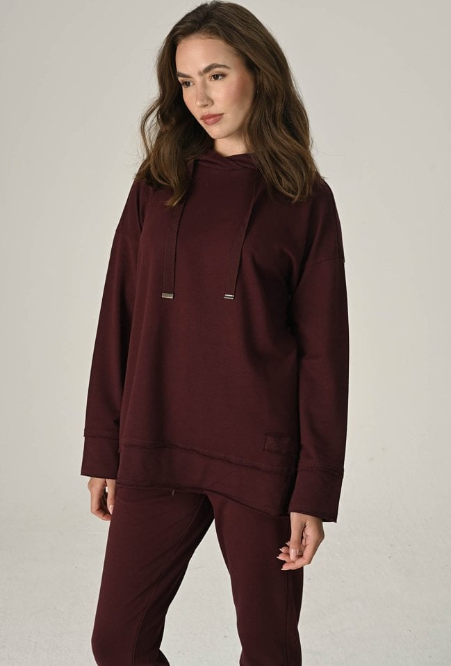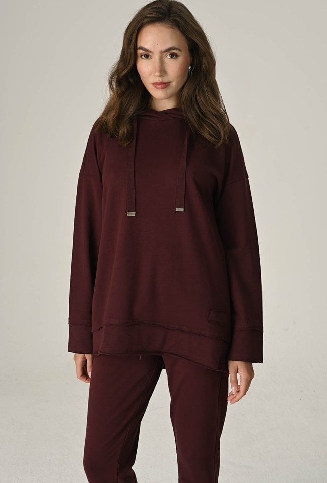Bluzka o klasycznym fasonie z kapturem. Wykonana jest z przyjemnej, miękkiej w dotyku dzianiny bawełnianej. Bluza posiada długi rękaw i brzegi wykończone surowym cięciem. Idealnie sprawdzi się w codziennych stylizacjach. Modelka na zdjęciu ma 173 cm wzrostu i prezentuje rozmiar S.