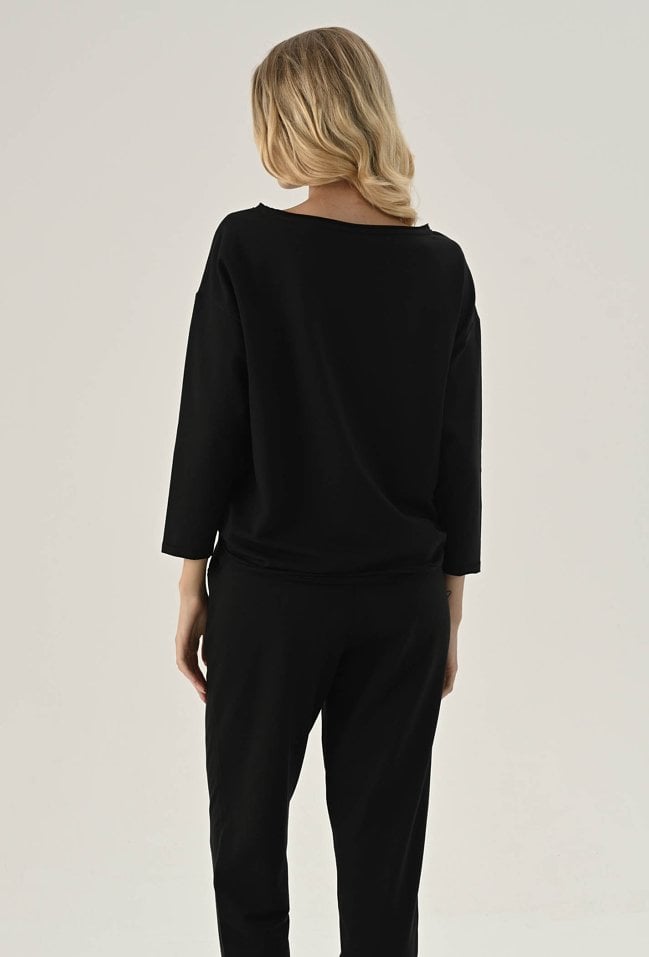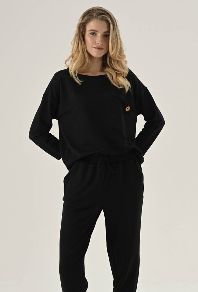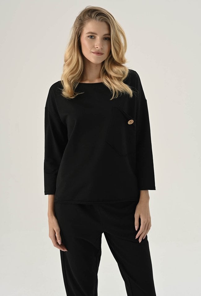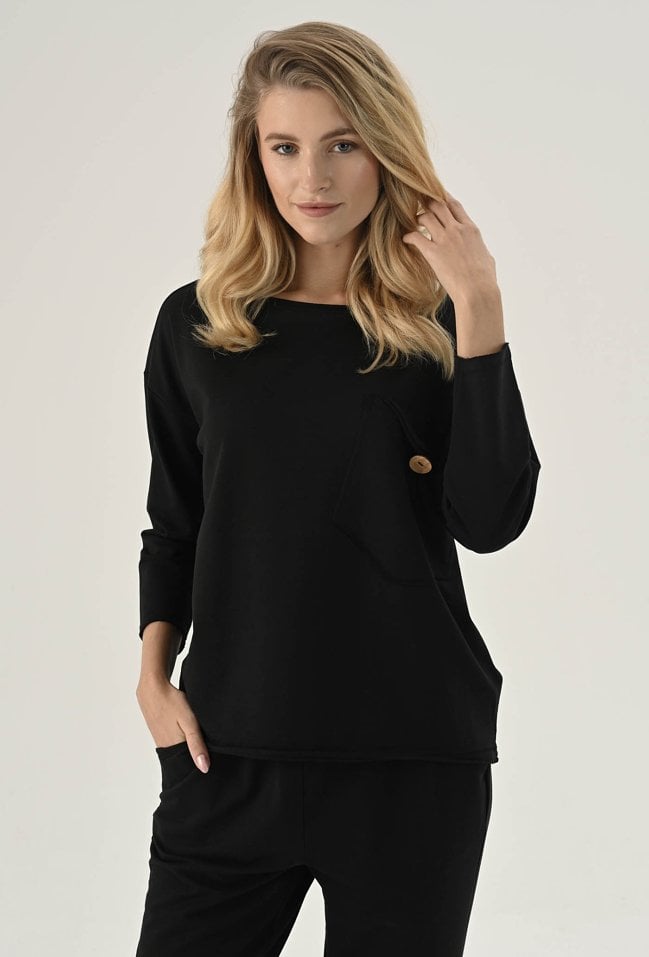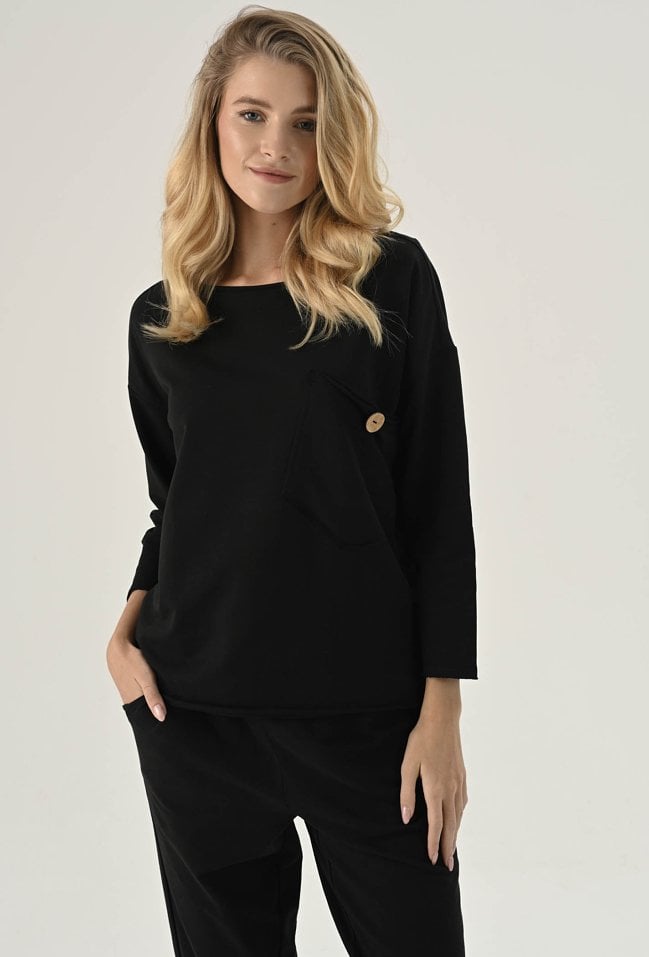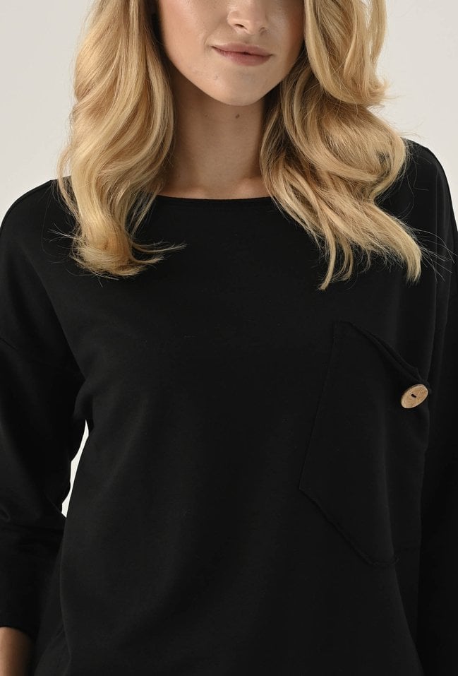 Bluza z ozdobną kieszeni w czarnym kolorze. Posiada długi rękaw wraz z obniżoną linią ramion. Kieszeń posiada ozdobny guzik. Ten model będzie idealną propozycja na co dzień w zestawie z spodniami dresowymi lub jeansami. Modelka na zdjęciu ma 177 cm wzrostu i prezentuje rozmiar 36.