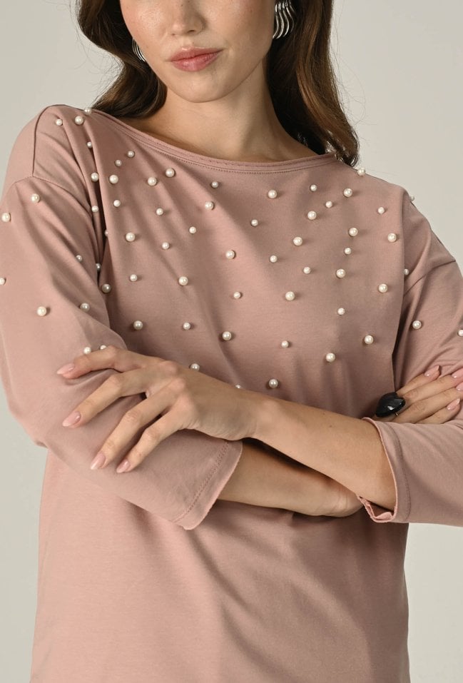 Bluza z miękkiej dzianiny o rękawie 3/4 to doskonałe połączenie wygody i stylu. Półokrągły dekolt subtelnie podkreśla szyję, a dekoracyjne perły na przodzie dodają wyjątkowego, kobiecego blasku. Idealna na co dzień oraz na specjalne okazje, gdy chcesz poczuć się wyjątkowo. Modelka na zdjęciu ma 174 cm wzrostu i prezentuje rozmiar 36.
