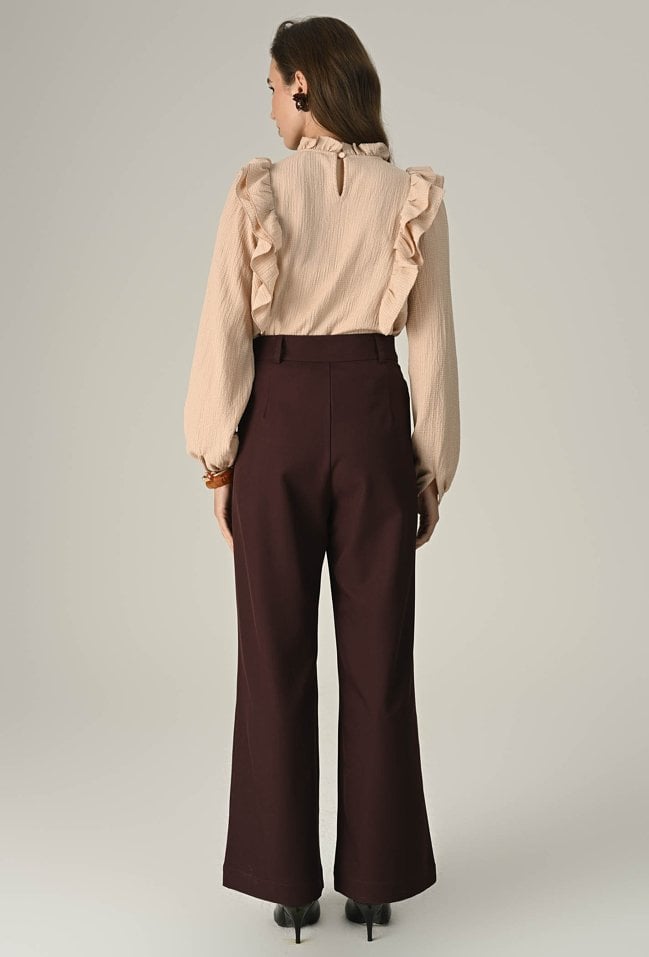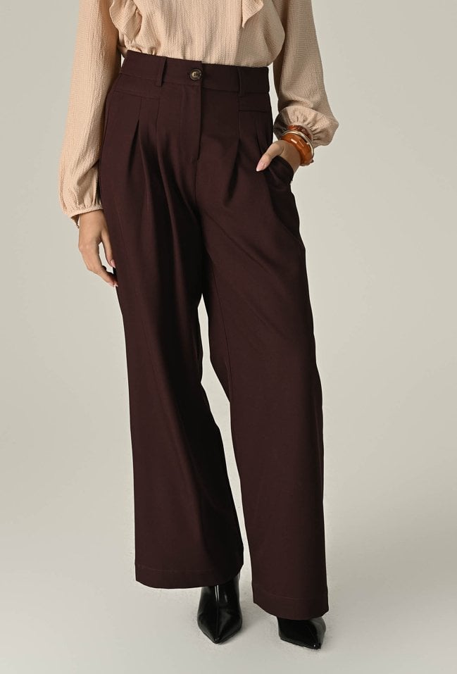 Spodnie o klasycznym fasonie, przyjemnego materiału, z szeroką nogawką i wysokim stanem, które doskonale podkreślają sylwetkę. Wyposażone w praktyczne kieszenie, są idealne do codziennych stylizacji, łącząc wygodę z elegancją. Modelka na zdjęciu ma 174 cm wzrostu i prezentuje rozmiar 36.