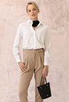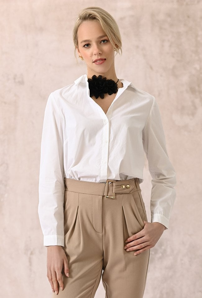 Biała koszula o prostym kształcie z długim rękawem zakończonym mankietem. Zapinana na guziki po długości, posiada kołnierz. Koszula idealnie sprawdzi się w codziennych i formalnych stylizacjach. Wykonana jest naturalnej bawełny, dzięki czemu zapewniając komfort nawet w trakcie upału. Modelka na zdjęciu ma 178 cm wzrostu i prezentuje rozmiar 36.