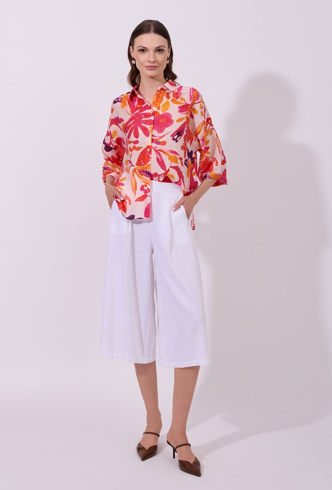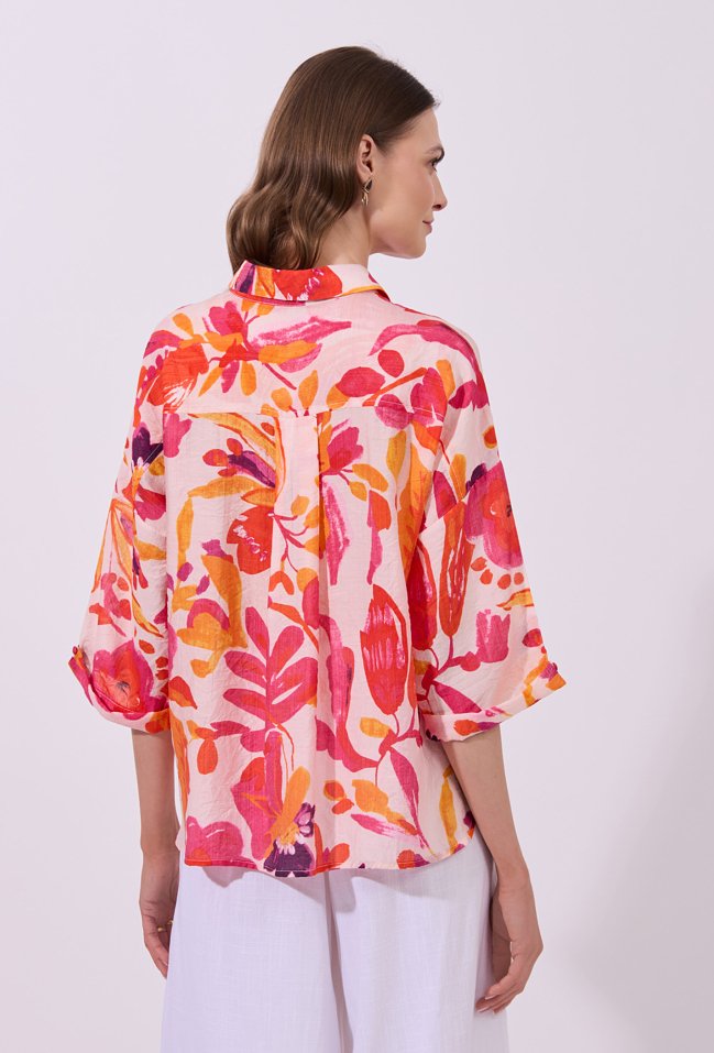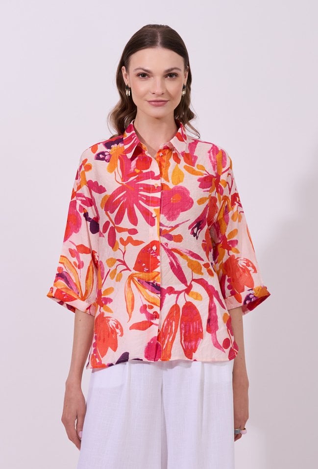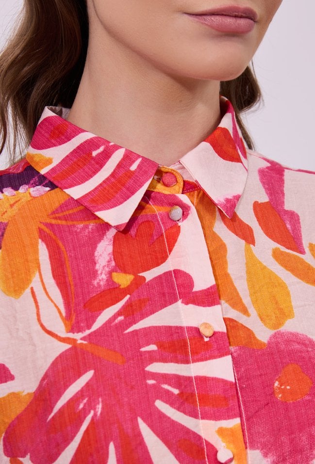 Koszula damska o luźnym, swobodnym kroju z rękawem o długości 3/4. Model zapinany na guziki, z klasycznym kołnierzykiem. Całość zdobi wyrazisty, kolorowy wzór z motywem kwiatowym, przyciągający uwagę i nadający stylizacji świeżości. Modelka na zdjęciu ma 177 cm wzrostu i prezentuje rozmiar S.
