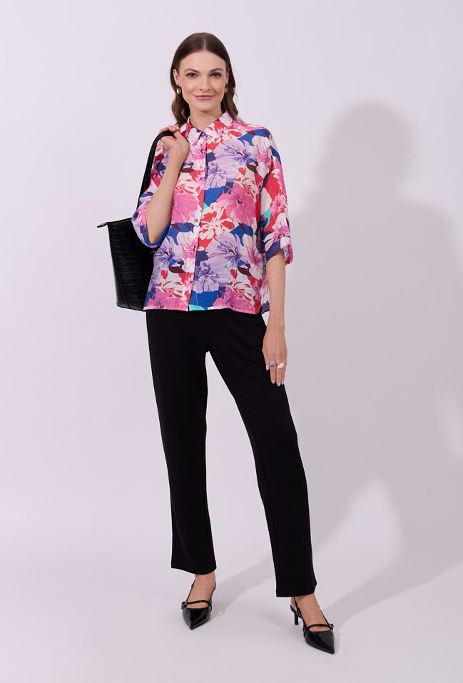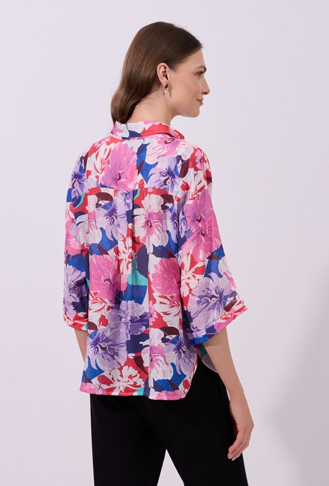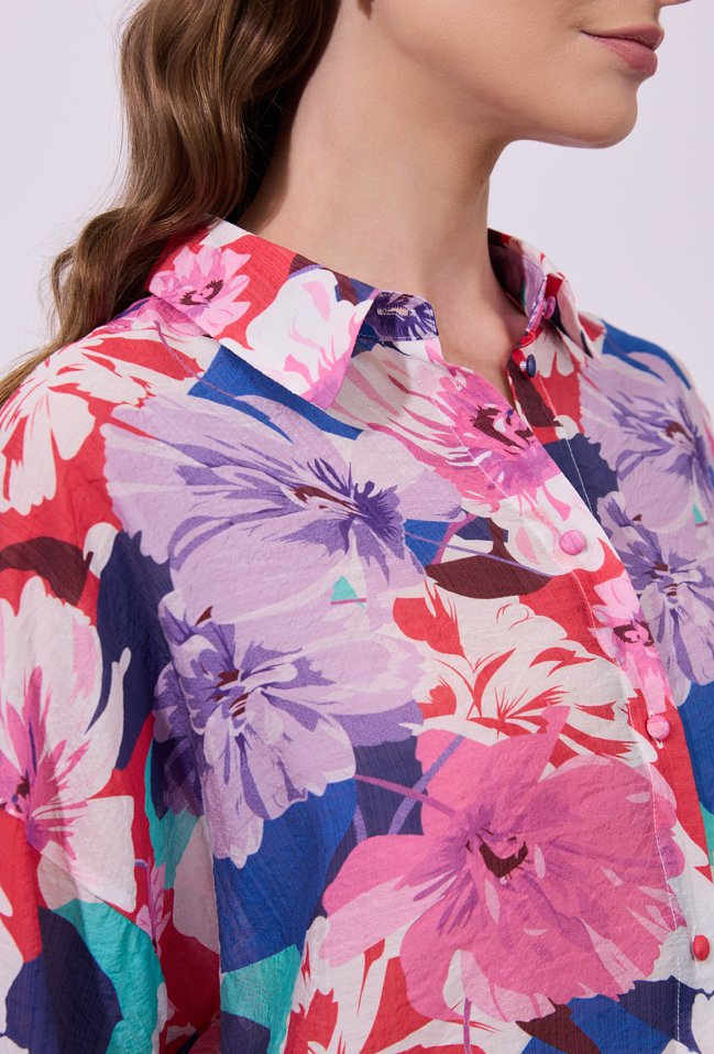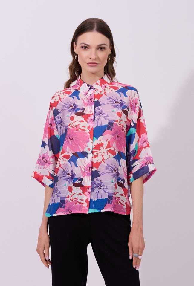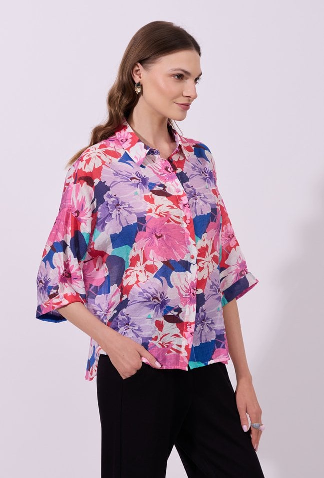 Koszula damska o luźnym, swobodnym kroju z rękawem o długości 3/4. Model zapinany na guziki, z klasycznym kołnierzykiem. Całość zdobi wyrazisty, kolorowy wzór z motywem kwiatowym, przyciągający uwagę i nadający stylizacji świeżości. Modelka na zdjęciu ma 177 cm wzrostu i prezentuje rozmiar S.