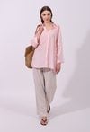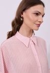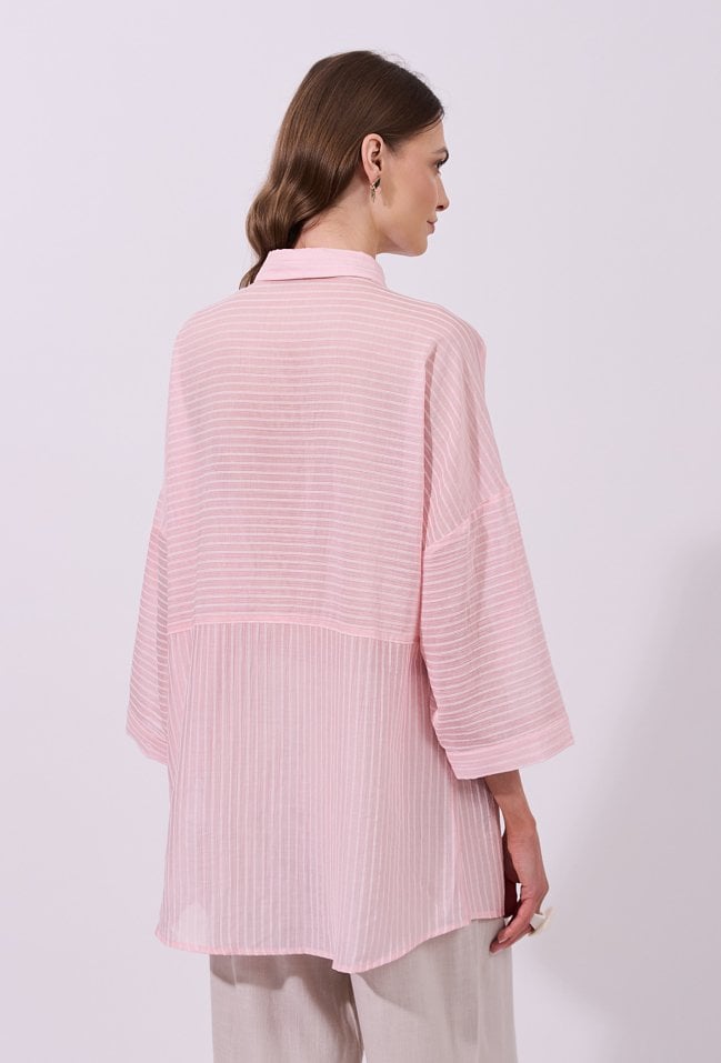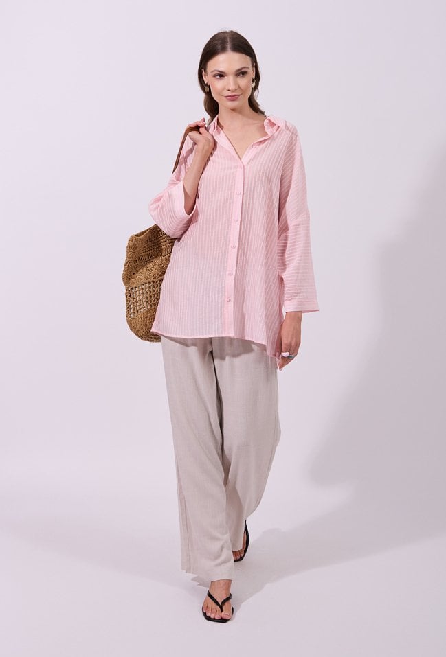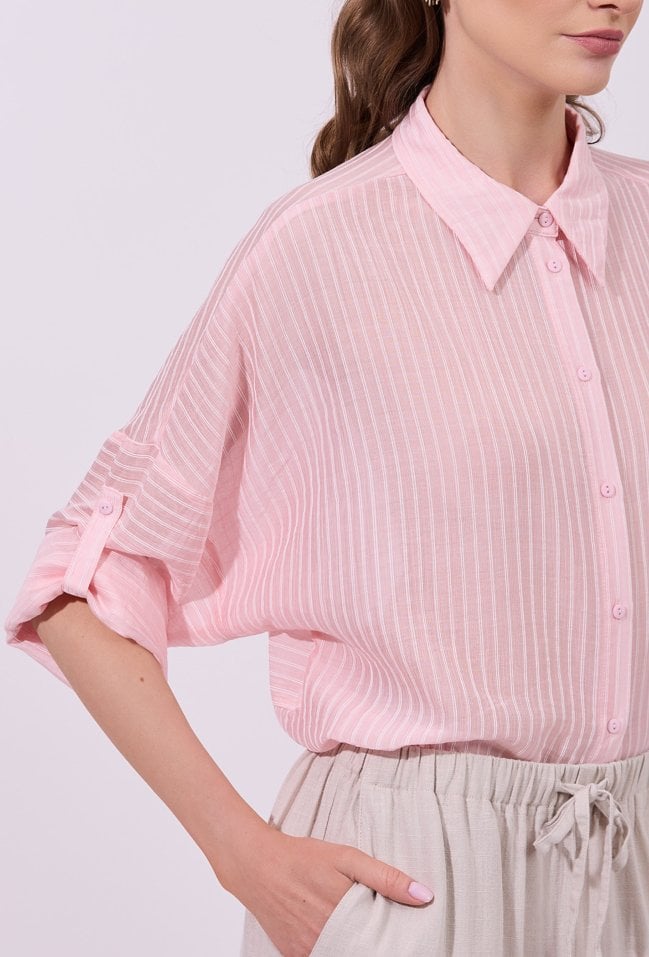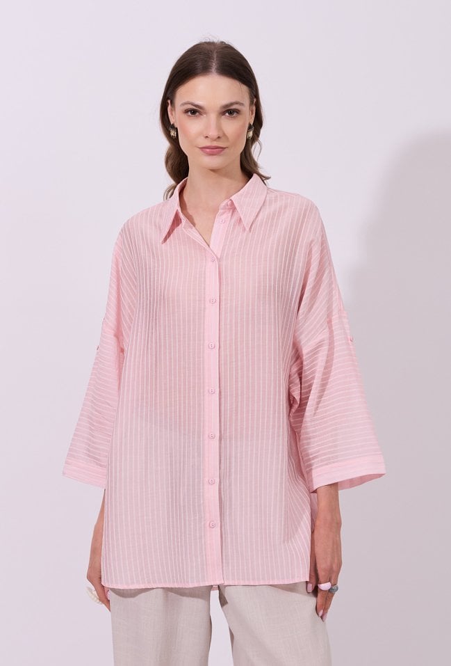 Koszula damska o luźnym, oversize’owym kroju z długim rękawem. Model zapinany na guziki, z klasycznym kołnierzykiem, który nadaje całości ponadczasowego charakteru. Idealna zarówno do casualowych, jak i bardziej eleganckich stylizacji. Modelka na zdjęciu ma 177 cm wzrostu i prezentuje rozmiar S.