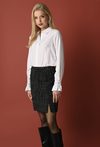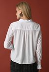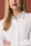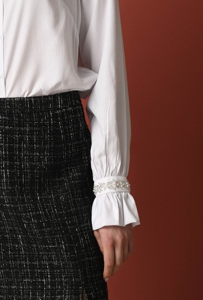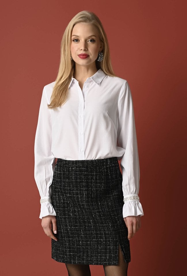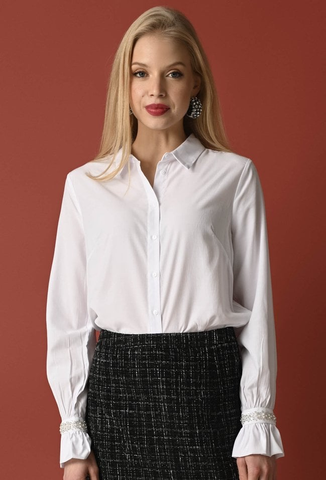 Ta biała koszula to połączenie klasyki i elegancji z subtelnym, biżuteryjnym akcentem. Perłowe wykończenie mankietów nadaje jej kobiecego wdzięku, a klasyczny kołnierzyk sprawia, że całość prezentuje się wyjątkowo stylowo. Model doskonale sprawdzi się zarówno na wyjątkowe okazje, jak i w codziennych stylizacjach do pracy. Koszula została wykonana z przyjemnej w dotyku tkaniny z dodatkiem wiskozy, co zapewnia wysoki komfort noszenia przez cały dzień.