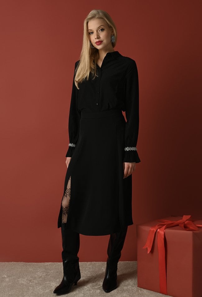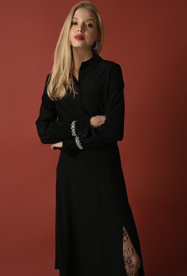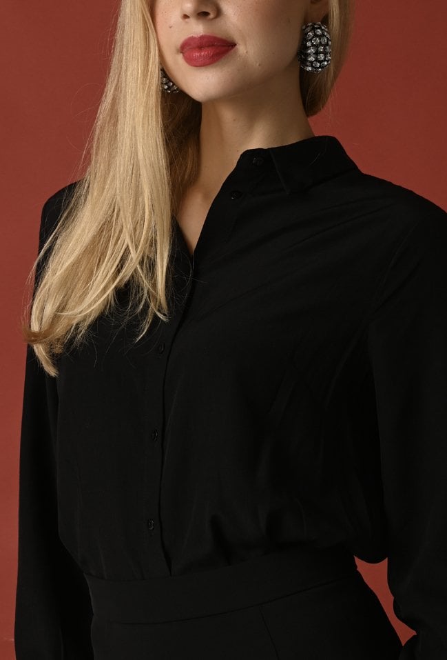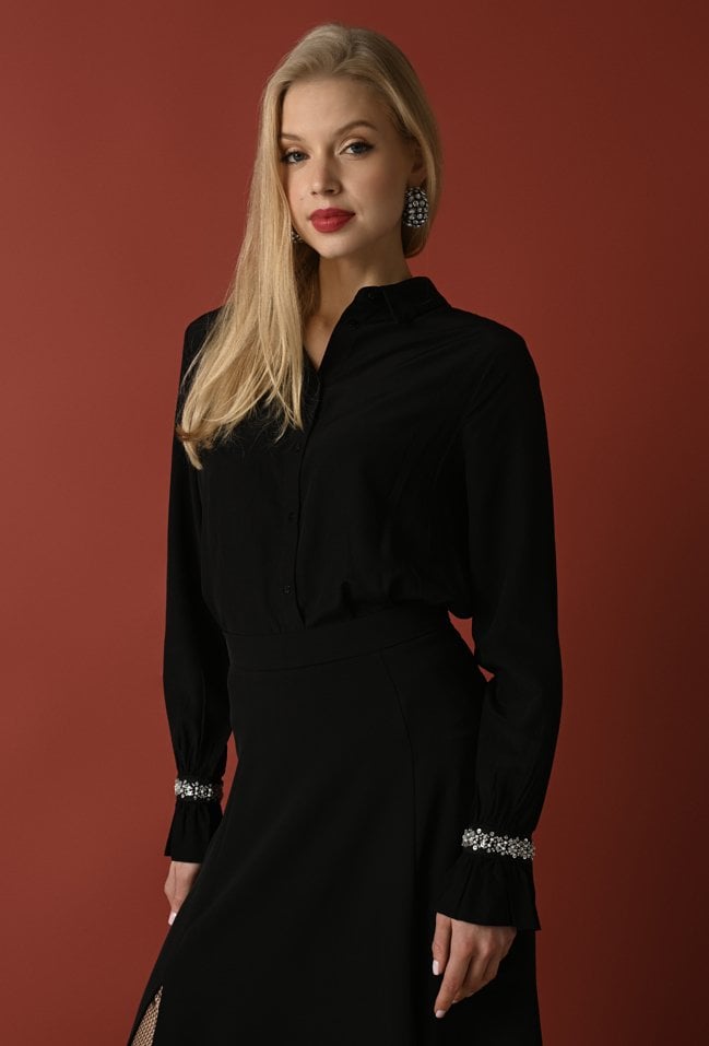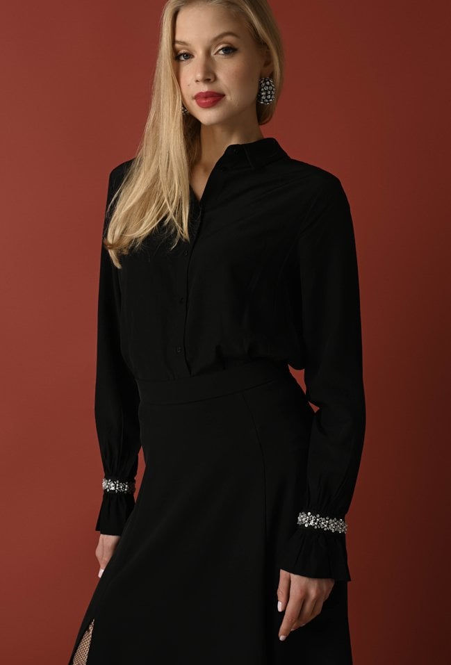 Ta czarna koszula to połączenie klasyki i elegancji z subtelnym, biżuteryjnym akcentem. Perłowe wykończenie mankietów nadaje jej kobiecego wdzięku, a klasyczny kołnierzyk sprawia, że całość prezentuje się wyjątkowo stylowo. Model doskonale sprawdzi się zarówno na wyjątkowe okazje, jak i w codziennych stylizacjach do pracy. Koszula została wykonana z przyjemnej w dotyku tkaniny z dodatkiem wiskozy, co zapewnia wysoki komfort noszenia przez cały dzień.