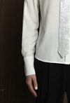 Koszula damska w neutralnym kolorze, z szerokimi mankietami zapinanymi na guziki. Uwagę przyciąga krawat ozdobny, który dodaje całości eleganckiego i nieco błyszczącego akcentu. Koszula świetnie sprawdzi się jako baza stylizacji – ma klasyczny fason, ale dzięki połyskującemu detalowi staje się wyjątkowa. Można ją nosić zarówno do prostych spodni, jak i spódnicy, tworząc stylowy, ale stonowany look z nutą oryginalności. Modelka na zdjęciu ma 177 cm wzrostu i prezentuje rozmiar 36.